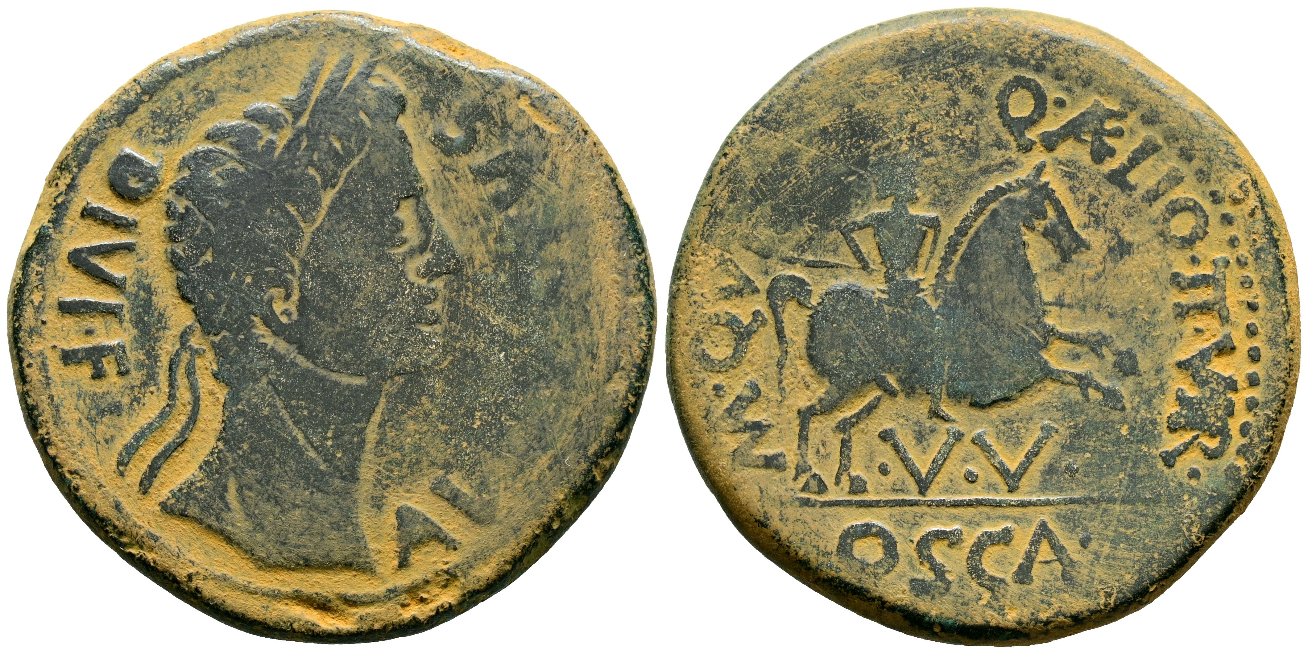 OSCA (Huesca). As. (Ae. 11,89g/30mm). 24 a.C.-14 d.C. (FAB-1926). Anv: Cabeza laureada de Augusto a derecha, alrededor leyenda: DIVI F AVGVSTVS. Rev: Jinete con lanza a derecha, debajo V V/OSCA. MBC-. Realzado.