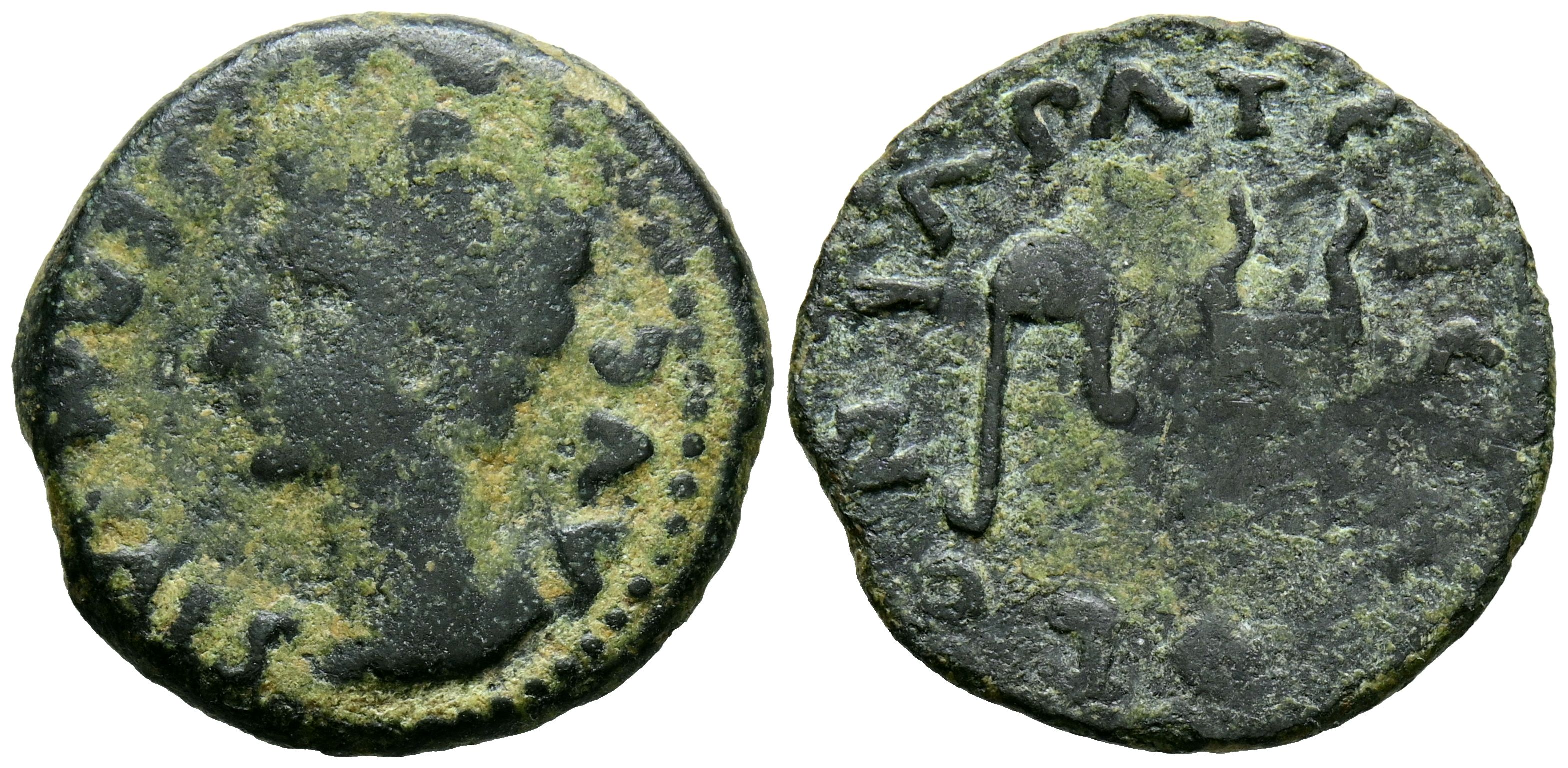 COLONIA PATRICIA (Córdoba). Semis. (Ae. 4,14g/22 mm). 27 a.C.-14 d.C. (FAB-1992). Anv: Cabeza de Augusto a la izquierda, alrededor leyenda: PERM CAES AVG. Rev: Sombrero flamígero y símbolo, alrededor de la leyenda: COLONIA PATRICIA. MBC-.