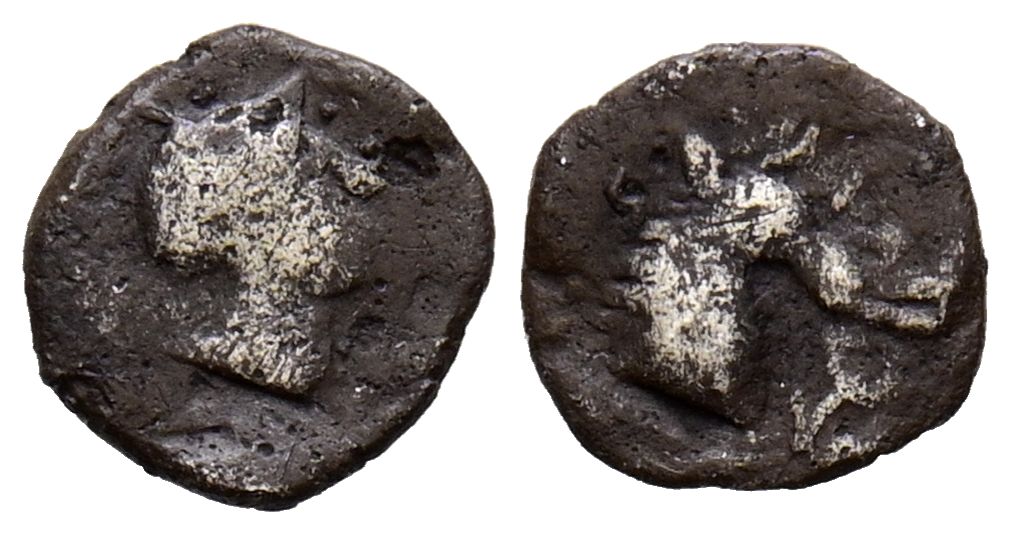 ARSE-SAGUNTO (Sagunto, Valencia). Hemióbolo. (Ar. 0,23g/7mm). 300-200 a.C. (FAB-2042). Anv: Cabeza galeada a derecha. Rev: Cabeza de caballo a derecha, alrededor leyenda ibérica. BC+. Escaso ejemplar.