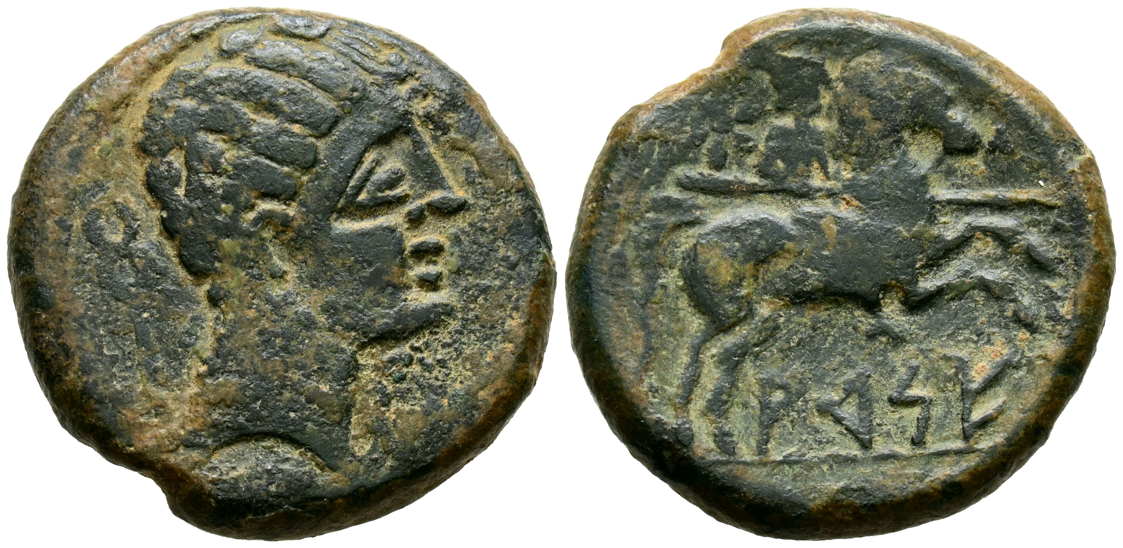 ARSE-SAGUNTO (Sagunto, Valencia). As. (Ae. 14,00g/26mm). 120-100 a.C. (FAB-2072). Anv: Cabeza masculina con drapeado a derecha, detrás caduceo. Rev: Jinete con lanza a derecha, encima estrella, debajo leyenda ibérica: ARSE. MBC-.