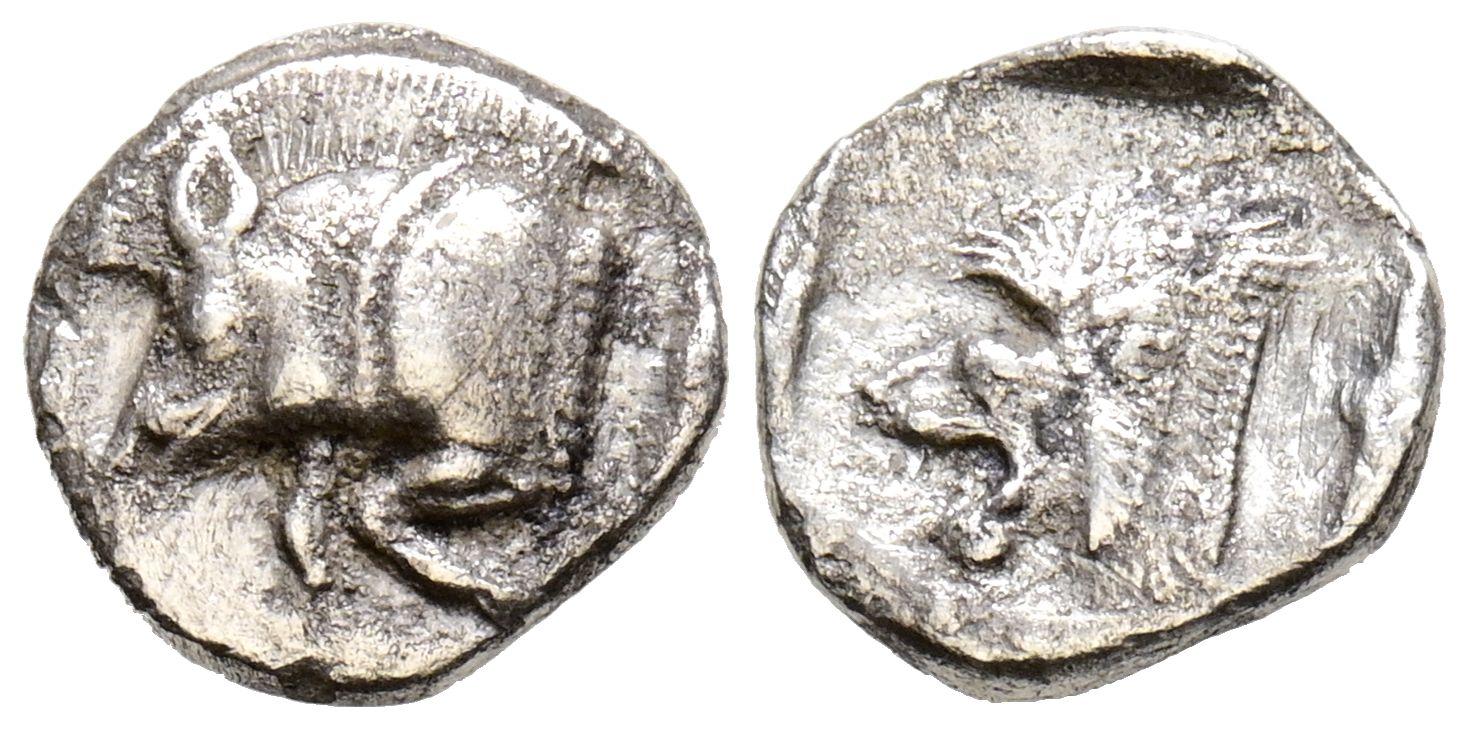 MISIA, Cícico. Óbolo. (Ar. 0,74g/10mm). 450-400 a.C. (SNG Francia 361). Anv: Parte delantera de Jabalí a izquierda, detrás atún. Rev: Cabeza de león a izquierda dentro de cuadrado incuso. MBC.
