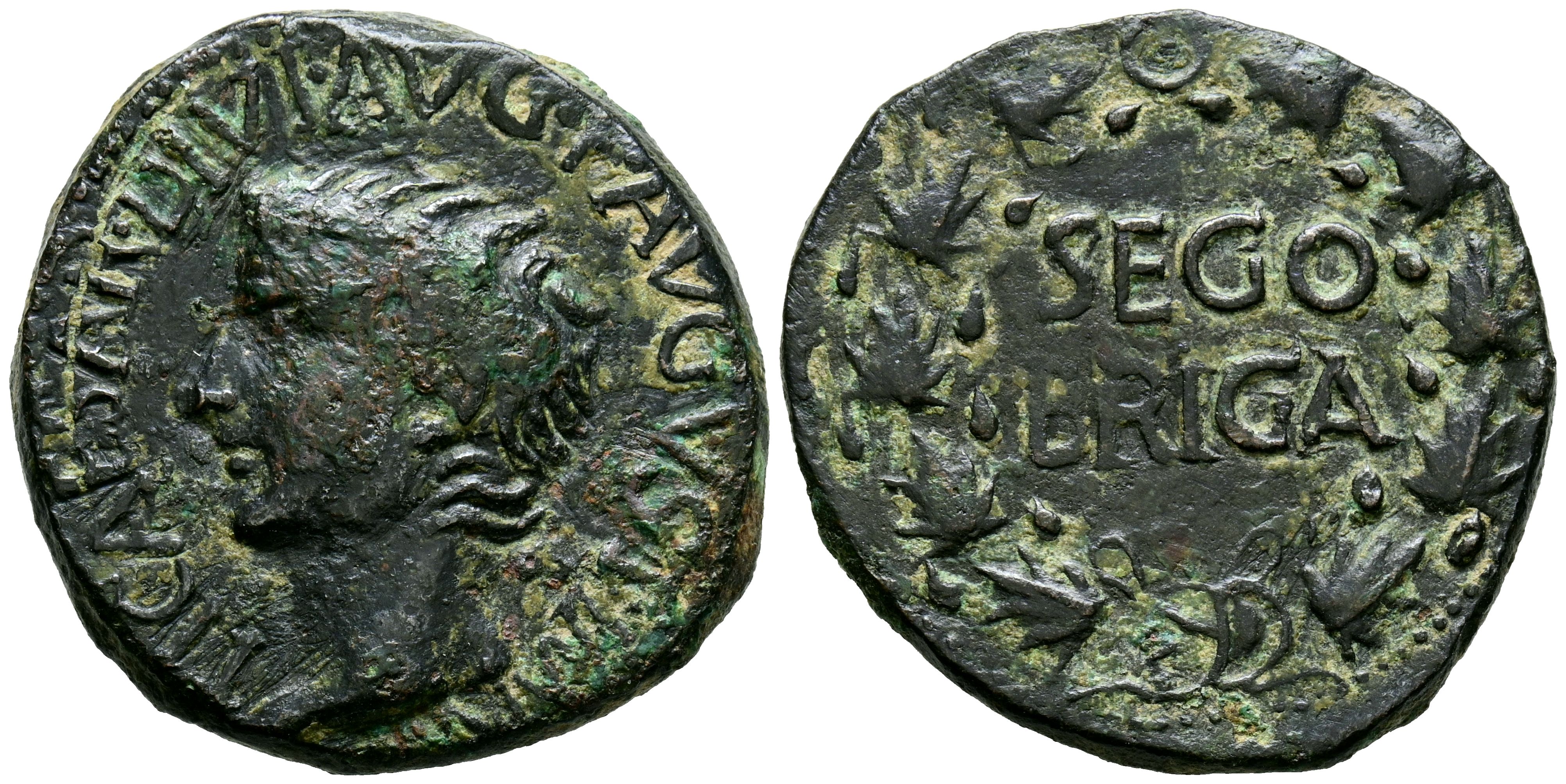 SEGOBRIGA (Saelices, Cuenca). As. (Ae. 13,10g/29mm). 14-36 d.C. (FAB-2188). Anv: Cabeza de Tiberio a izquierda, alrededor leyenda: TI CAESAR DIVI AVG F AVGVS F IMP VIII. Rev: Leyenda: SEGO/BRIGA, dentro de láurea. MBC.