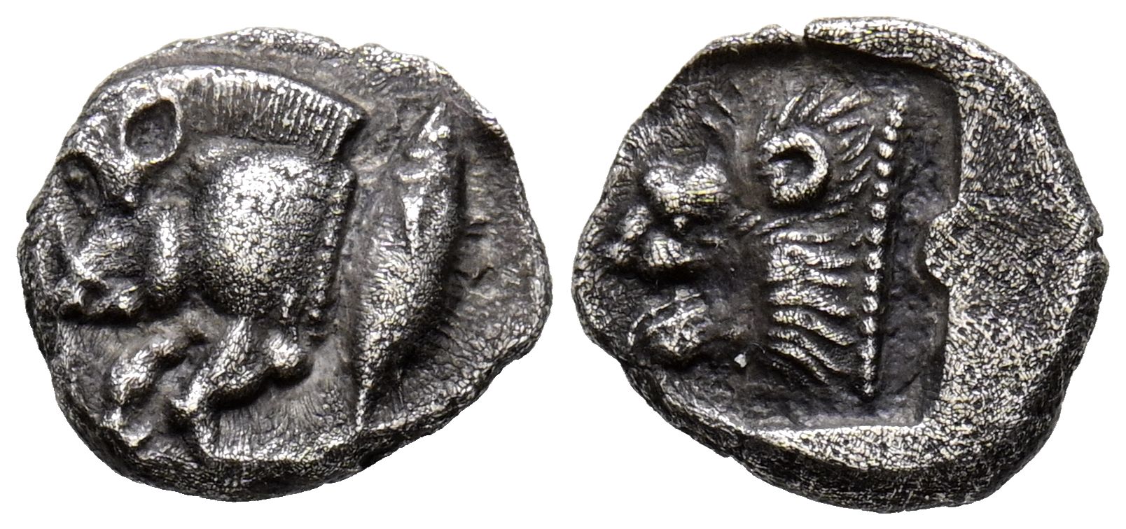 MISIA, Cícico. Obolo. (Ar. 1,15g/11mm). 480-400 a.C. (SNG Francia 375). Anv: Parte delantera de Jabalí a izquierda, detrás atún. Rev: Cabeza de león a la izquierda dentro de un cuadrado incuso. MBC+.