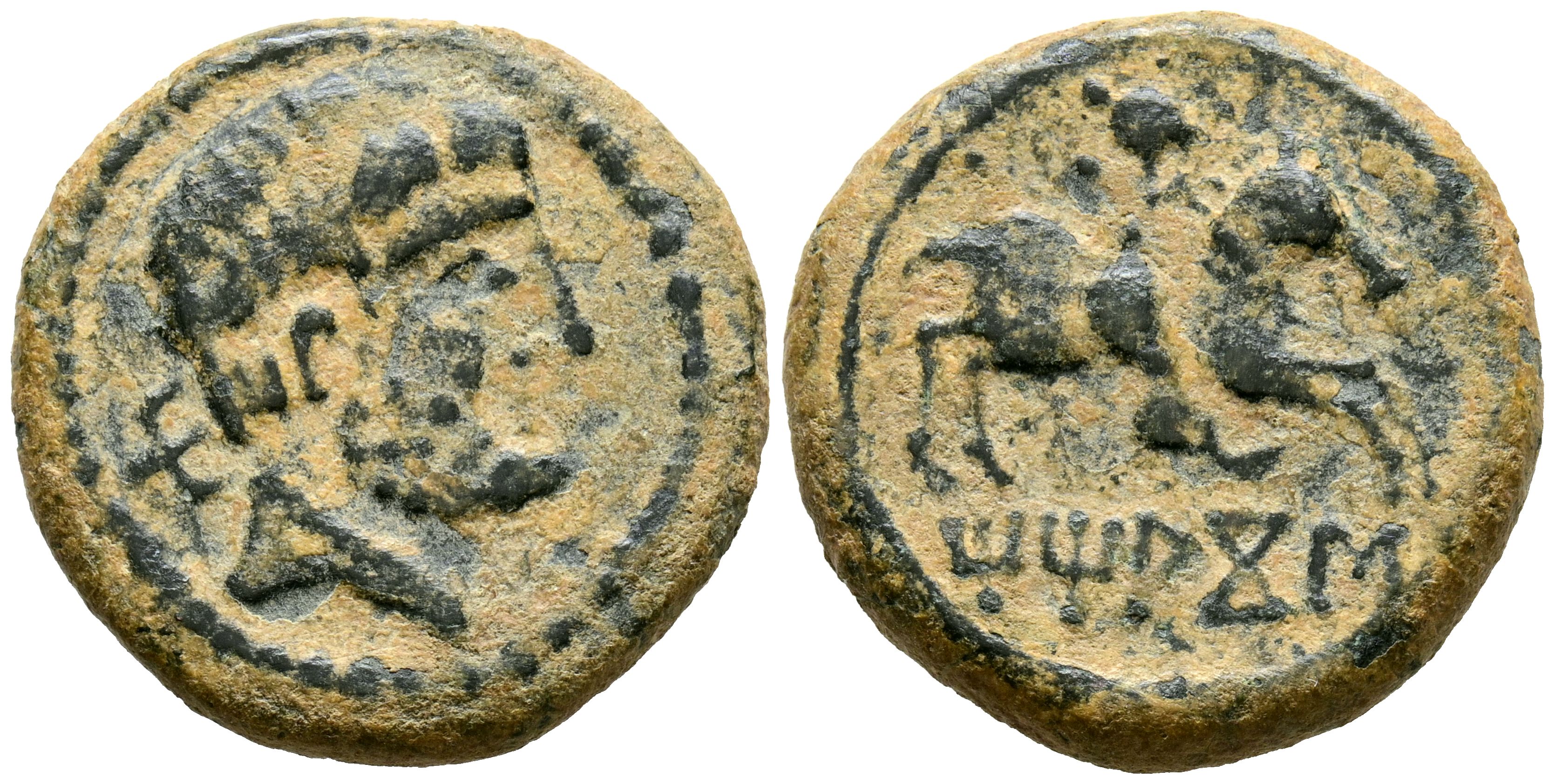 TITIACOS (Tricio, La Rioja). As. (Ae. 9,24g/23mm). 120-20 a.C. (FAB-2392). Anv: Cabeza masculina barbada a derecha, detrás letrá: Ti. Rev: Jinete con lanza a derecha, debajo leyenda ibérica: TiTiACoS. MBC-.