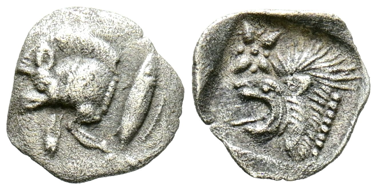 MISIA, Cícico. Obolo. (Ar. 0,23g/9mm). 450-400 a.C. (SNG France 375). Anv: Parte delantera de Jabalí a izquierda, detrás atún. Rev: Cabeza de león a izquierda dentro de cuadrado incuso, en campo estrella. MBC.