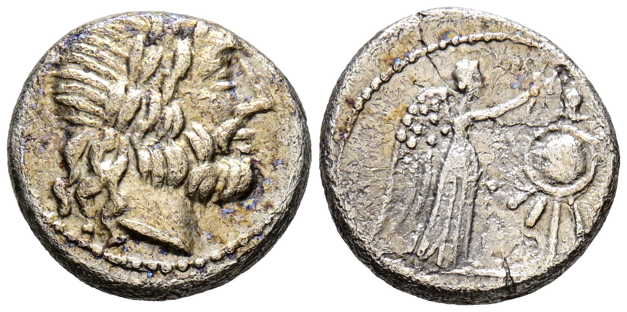 ACUÑACIONES ANONIMAS. Victoriato. (Ar. 1,57g/16mm). 211-208 a.C. Roma. (Crawford 53/1). Anv: Cabeza laureada de Júpiter a derecha. Rev: Victoria estante a derecha coronando trofeo de armas, en exergo: ROMA. MBC.