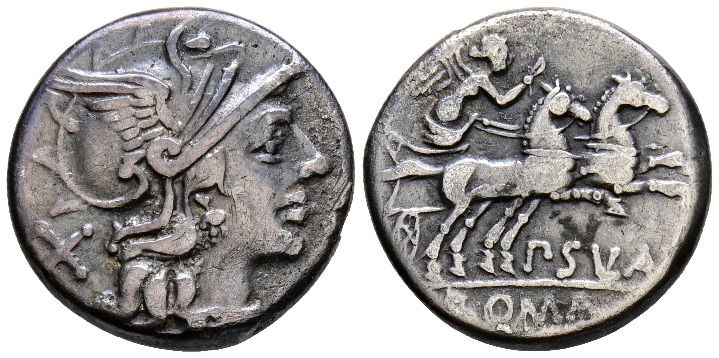 GENS CORNELIA. Denario. (Ar. 3,69g/17mm). 151 a.C. Roma. (FFC 607; Crawford 205/1). Anv: Cabeza de Roma a derecha, detrás X. Rev: Victoria con látigo en biga a derecha, debajo leyenda: P SVLA, en exergo: ROMA. MBC.
