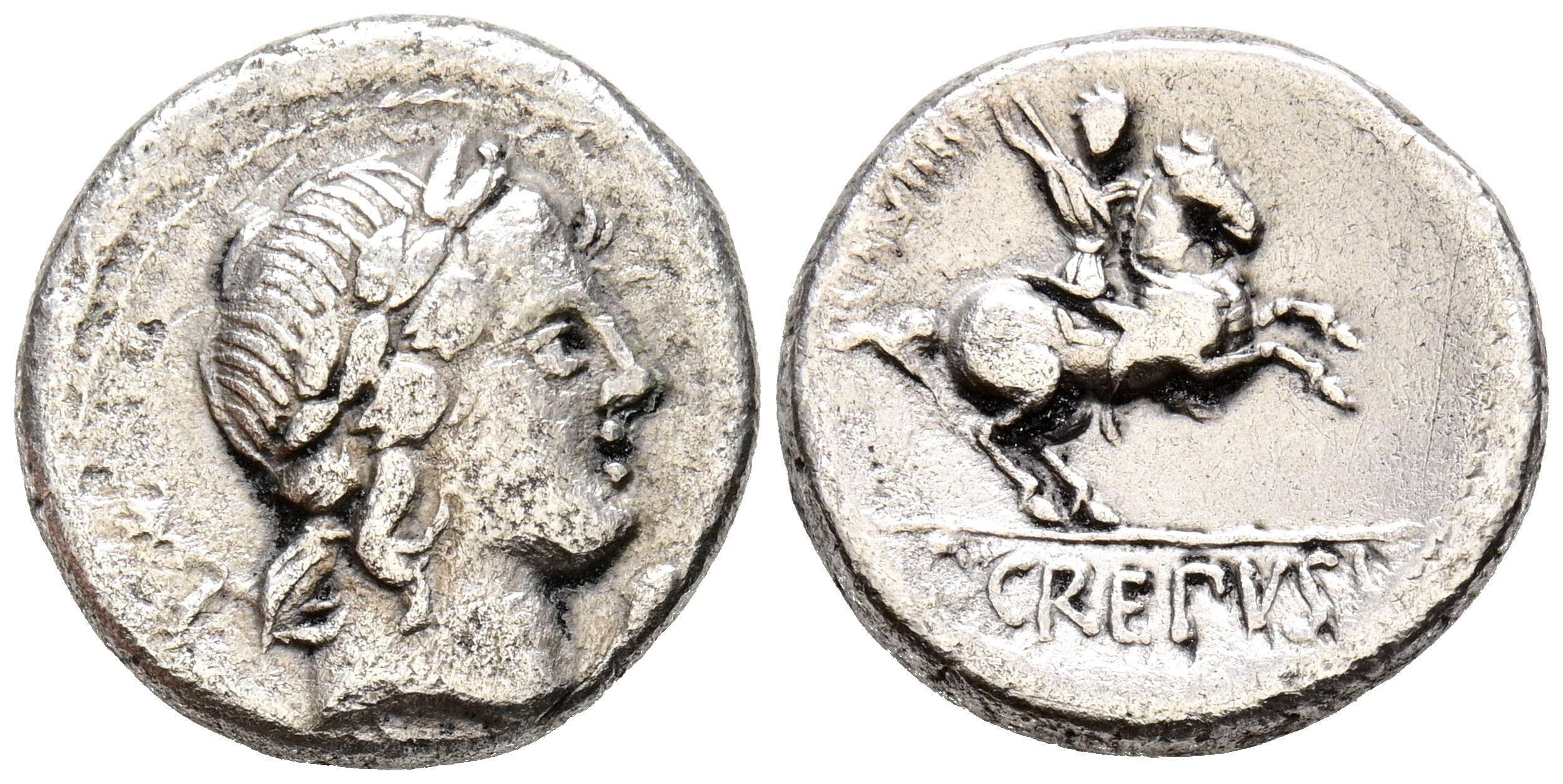 GENS CREPUSIA. Denario. (Ar. 3,83g/17mm). 82 a.C. (Crawford 361/1c; FFC 659). Anv: Cabeza de Apolo laureada a derecha, destrás cetro. Rev: Jinete cabalgando hacia derecha blandiendo lanza corta, detrás: XVIIII, en exergo: P CREPVSI. MBC. Limpiada.