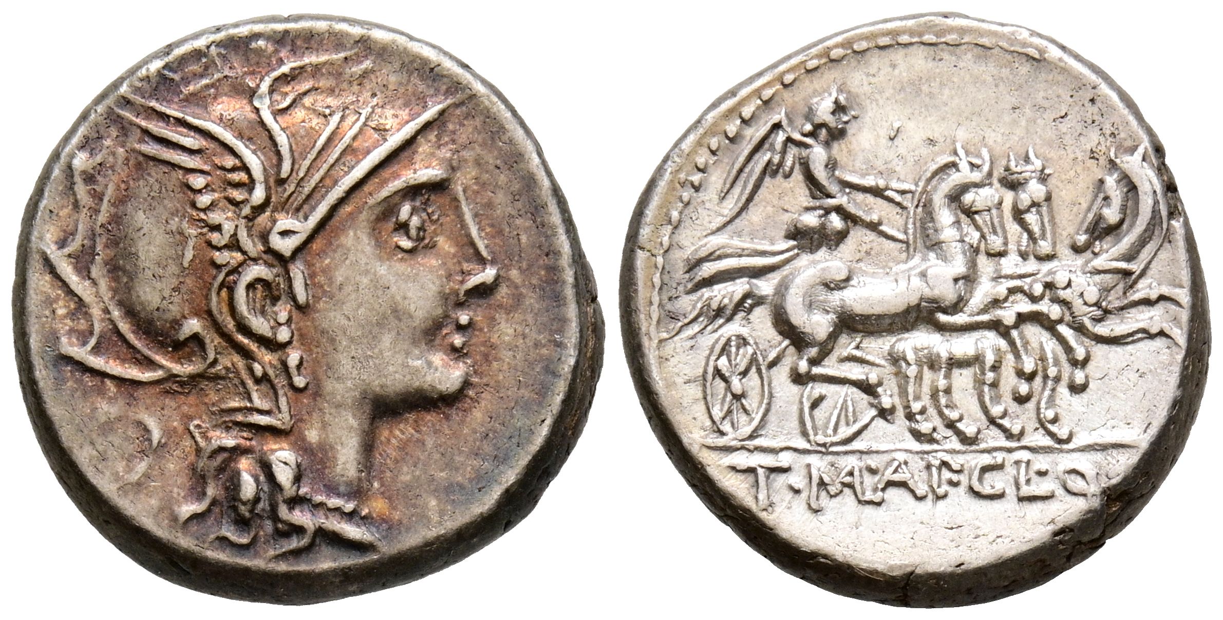 GENS MALLIA. Denario. (Ar. 3,99g/17mm). 111-110 a.C. Roma. (Crawford 299/1b; FFC 834). Anv: Cabeza de Roma con casco a derecha, detrás círculo. Rev: Victoria conduciendo triga a derecha, en exergo: T MAL AP CL Q VR. MBC+/EBC-.