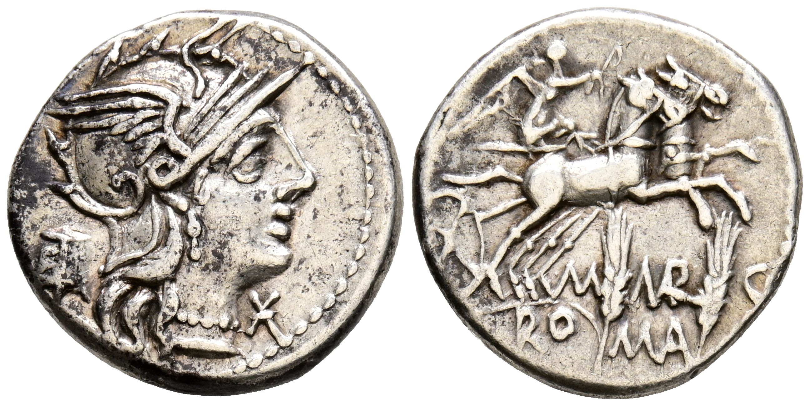 GENS MARCIA. Denario. (Ar. 3,84g/18mm). 134 a.C. Roma. (Crawford 245/1; FFC 850). Anv: Cabeza de Roma a derecha, delante estrella, detrás modio. Rev: Victoria con látigo conduciendo biga a derecha, debajo dos espigas con leyenda entre ellas: M MAR C/ROMA. MBC+.