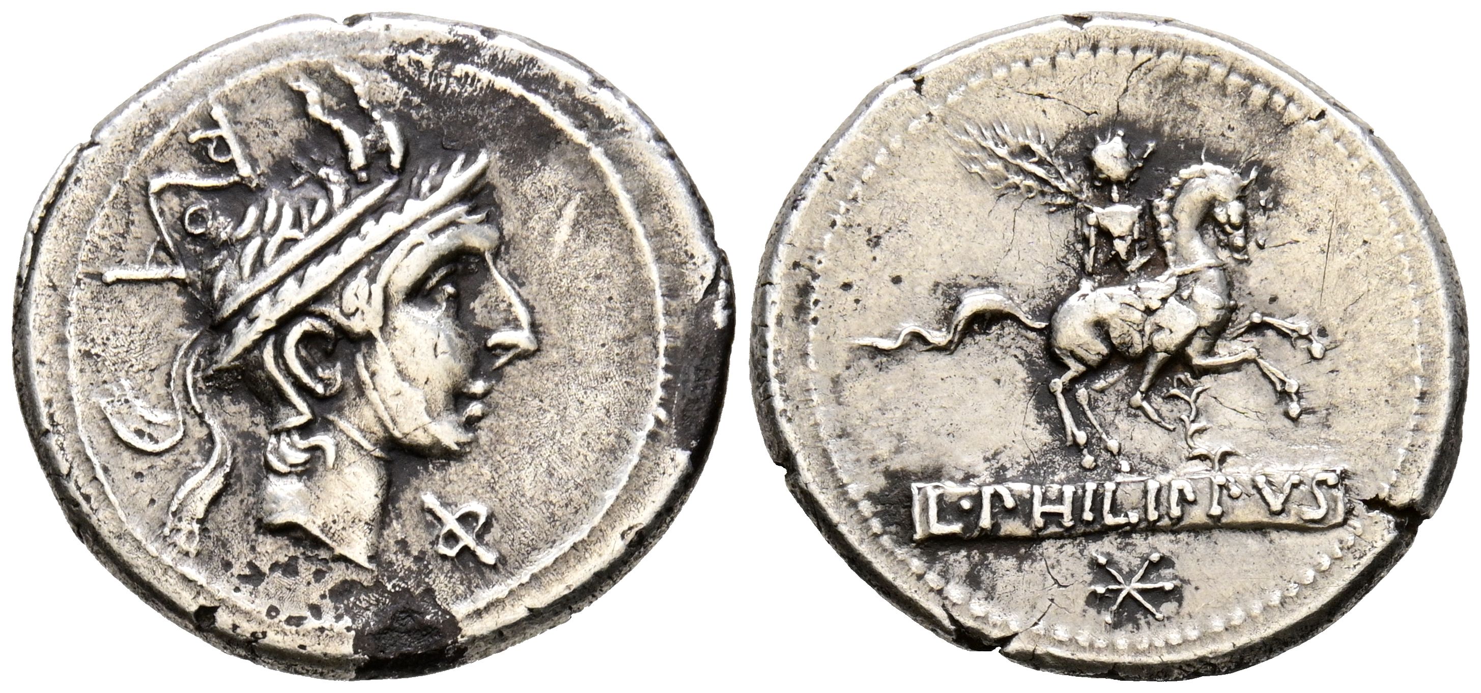 GENS MARCIA. Denario. (Ar. 3,83g/20mm). 113-112 a.C. Italia Central. (Crawford 293/1; FFC 852). Anv: Cabeza de Filipo V de Macedonia a derecha, delante letra griega, detrás monograma: ROMA. Rev: Estatua ecuestre a derecha, en la base leyenda: L PHILIPPVS, debajo estrella. MBC+. Bonito ejemplar.