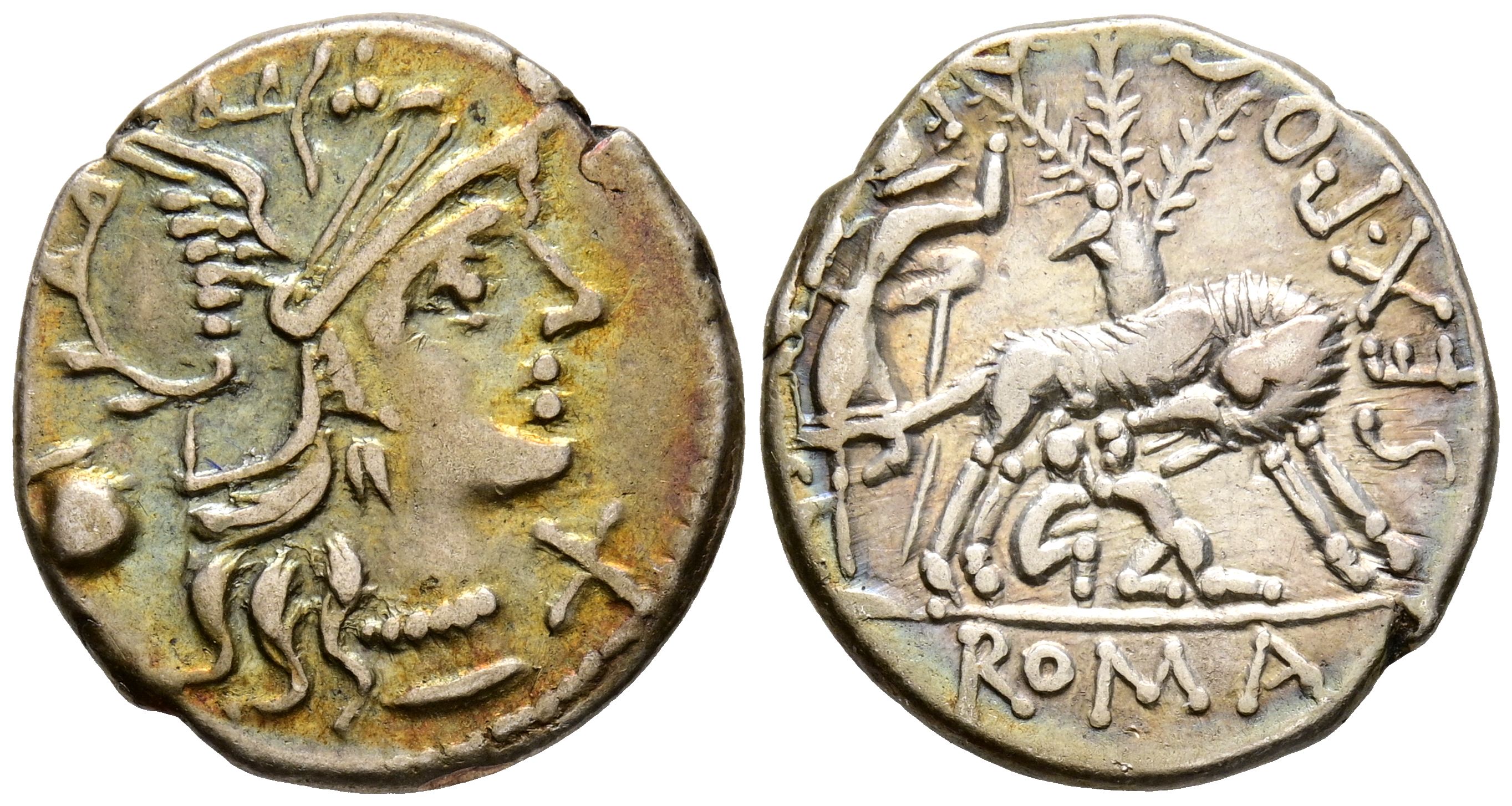 GENS POMPEIA. Denario. (Ar. 3,90g/20mm). 137 a.C. Italia Central. (Crawford 235/1a; FFC 1018). Anv: Cabeza de Roma a derecha, delante X, detrás vaso. Rev: Loba a derecha alimentando a Rómulo y Remo, a izquierda el pastor Faustulos, detrás árbol con tres pájaros, alrededor leyenda: SEX POM FOSTLVS, en exergo: ROMA. MBC/MBC+. Ligero tono.