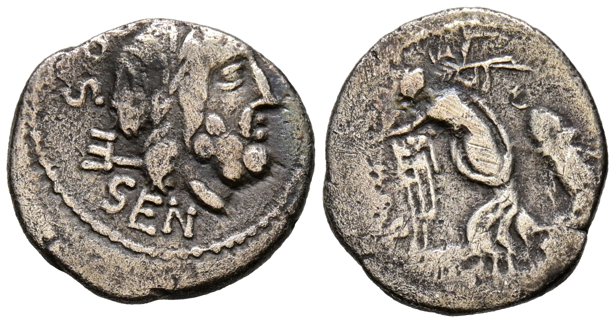 GENS RUBRIA. Quinario. (Ar. 1,62g/15mm). 87 a.C. Roma. (Crawford 348/4). Anv: Cabeza laureada de Neptuno, detrás tridente y leyenda: DOSSEN. Rev: Victoria avanzando a derecha portando corona de laurel y palma, delante serpiente enrollada a altar, detrás leyenda: L RVBRI. MBC-.