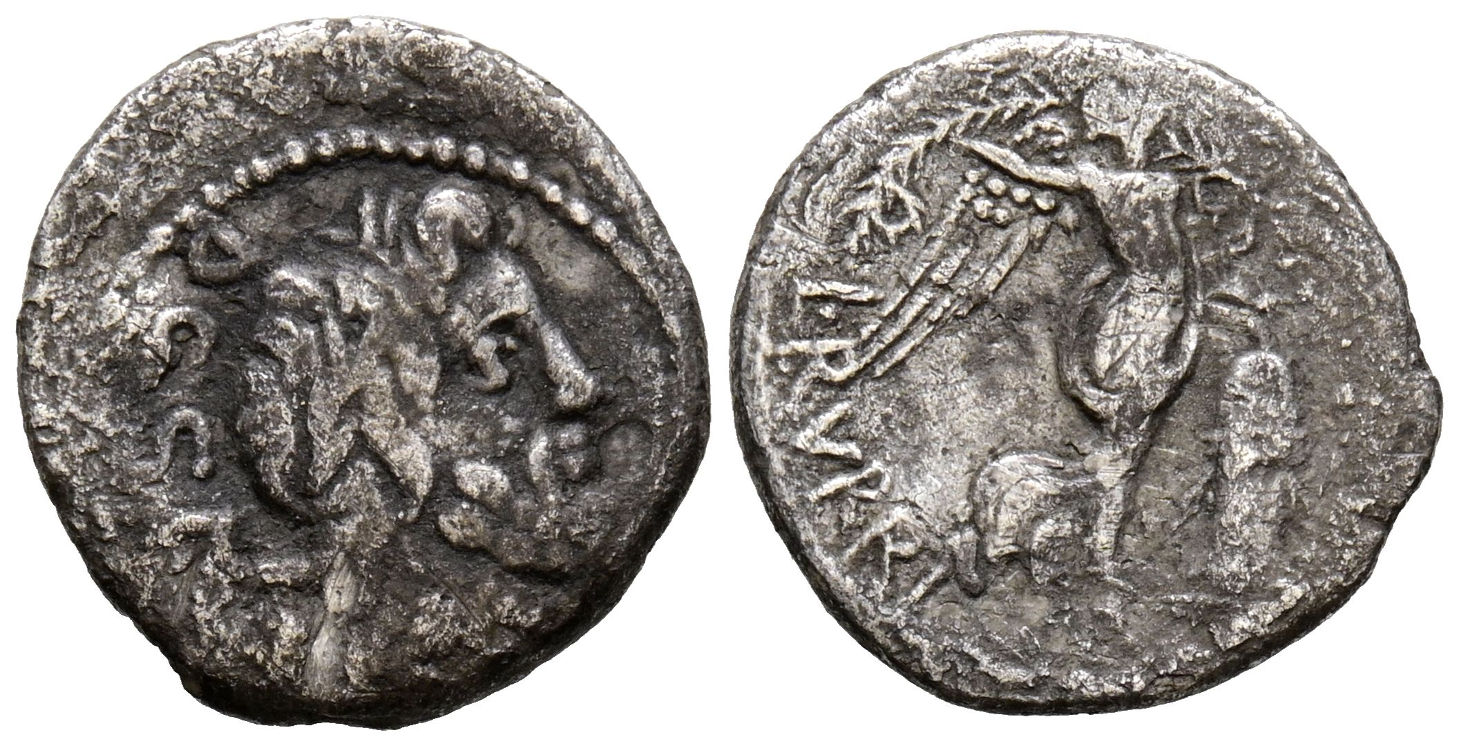 GENS RUBIA. Quinario. (Ar. 1,54g/15mm). 87 a.C. Roma. (Crawford 348/4). Anv: Cabeza laureada de Neptuno, detrás tridente y leyenda: DOSSEN. Rev: Victoria avanzando a derecha portando corona de laurel y palma, delante serpiente enrollada a altar, detrás leyenda: L RVBRI. MBC.