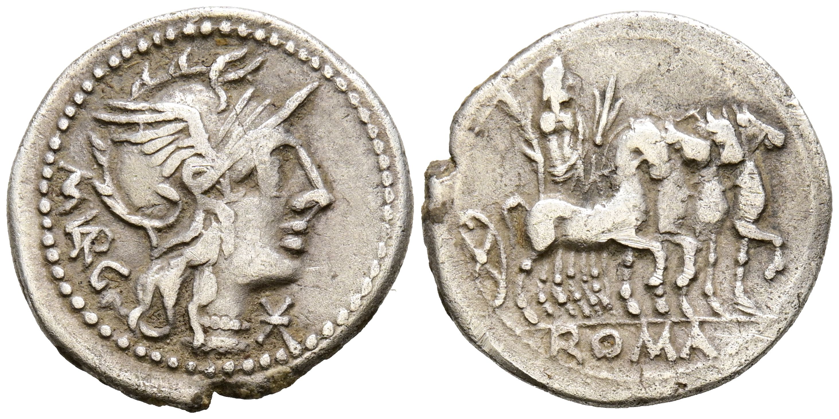 GENS VARGUNTEIA. Denario. (Ar. 3,73g/21mm). 130 a.C. Roma. (Crawford 257/1; FFC 1183). Anv: Cabeza de Roma a derecha, delante estrella, detrás leyenda: M VARG. Rev: Júpiter en cuádriga a derecha con rama de palma y haz de rayos, en exergo: ROMA. MBC-.