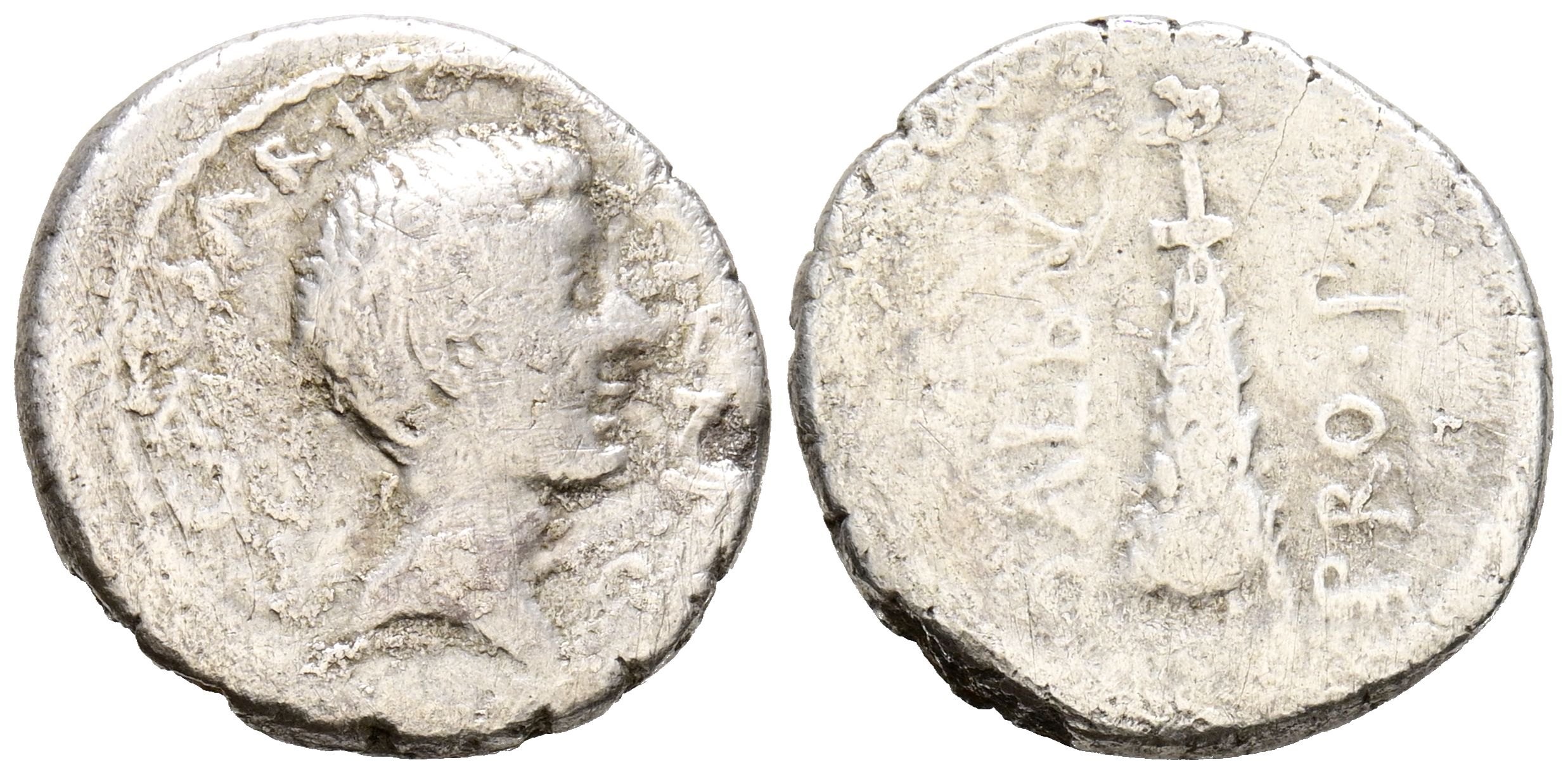 OCTAVIO. Denario. (Ar. 3,51g/18mm). 44-27 a.C. Ceca militar móvil. (Crawford 518/1; FFC 266). Anv: Cabeza de Octavio a derecha, alrededor leyenda: C CAESAR III VIR R P C. Rev: Mazo a izquierda, alrededor leyenda: BALBVS PRO PR. BC+. Escaso ejemplar.