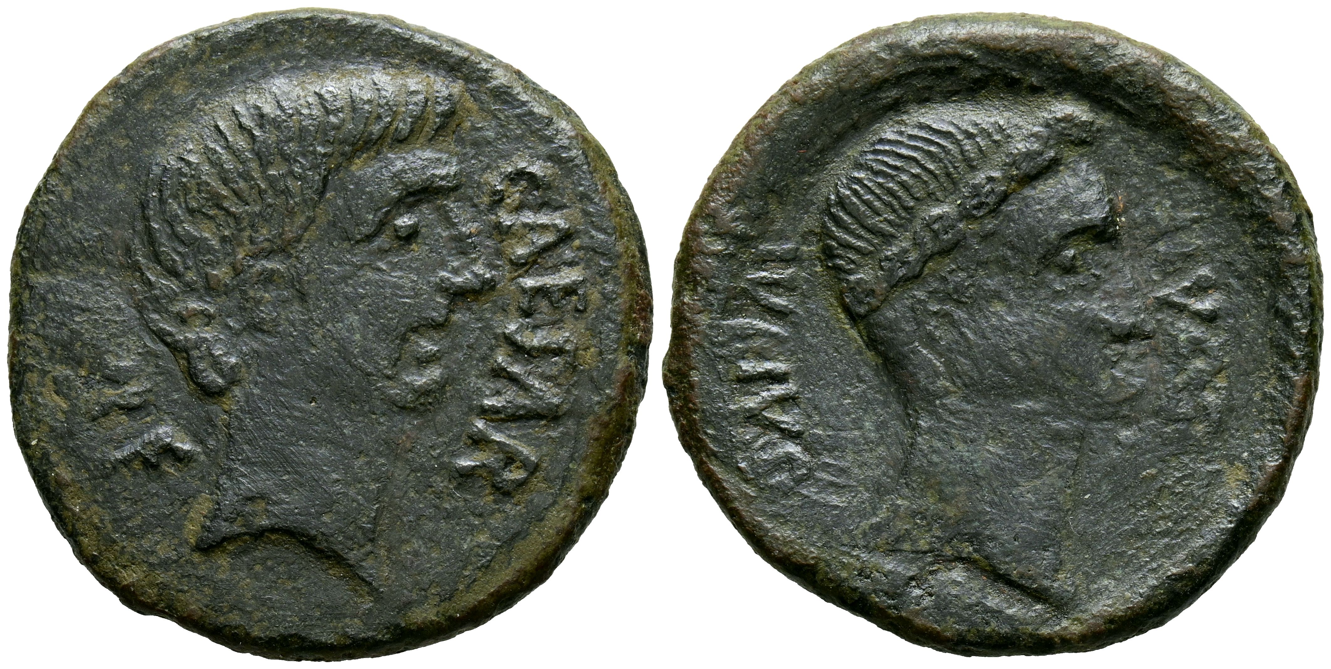 AUGUSTO y JULIO CESAR. Sestercio. (Ae. 13,18g/30mm). 38 a.C. Sur de Italia. (Crawford 535/1). Anv: Cabeza de Augusto a derecha, alrededor leyenda: CAESAR DIVI F. Rev: Cabeza laureada de Julio César a derecha, alrededor leyenda: DIVOS IVLIVS. MBC-. Repasada mecánicamente.