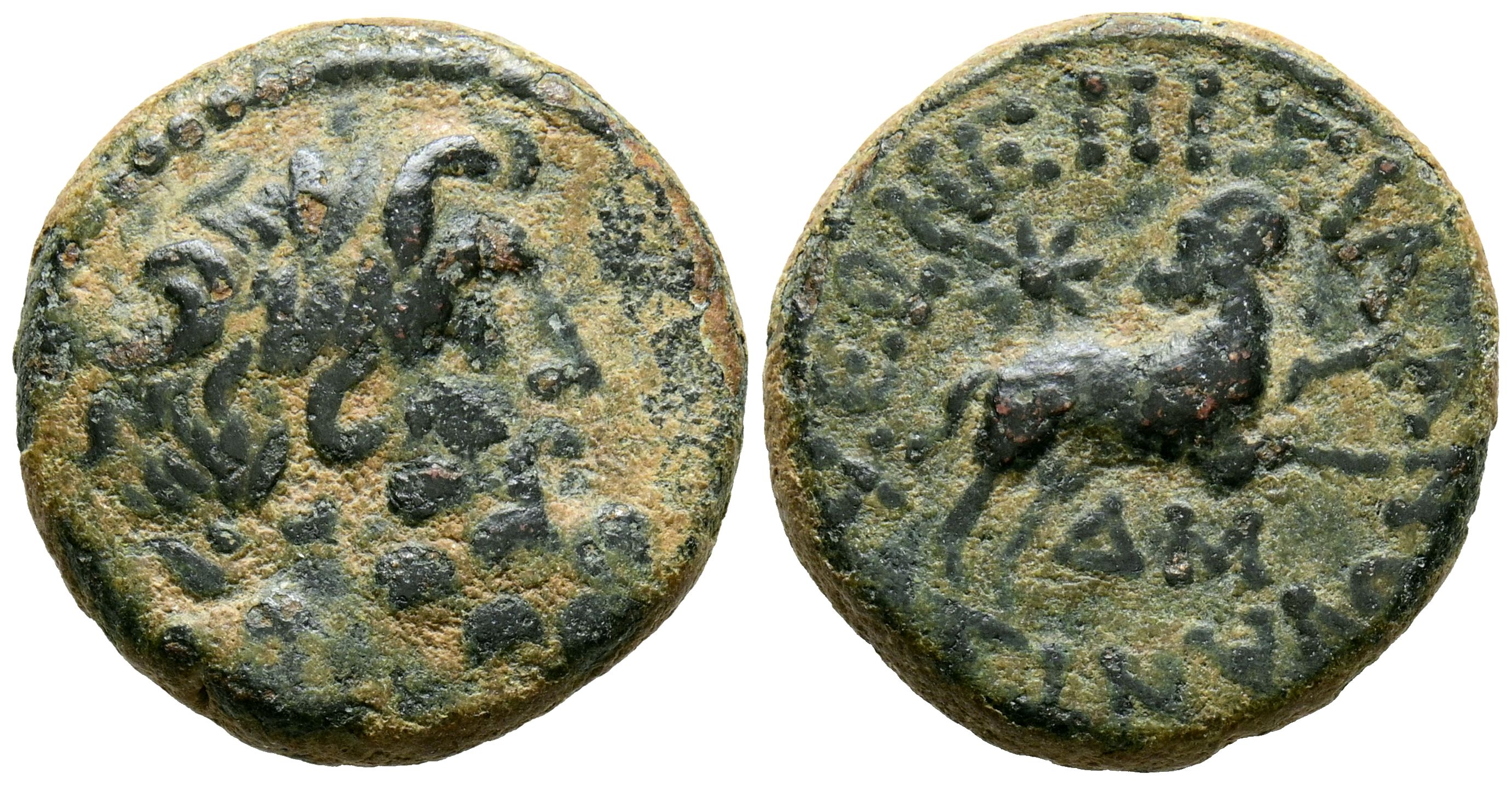 AUGUSTO, Acuñación pseudo-autónoma. Ae20. (Ae. 7,39g/20mm). 5-6 d.C. Antioquía. (RPC I 4265; McAlee 95). Anv: Cabeza laureada de Zeus a la derecha. Rev: Carnero saltando a la derecha, cabeza a la izquierda; estrella arriba, abajo monograma, alrededor leyenda: ΑΝΤΙΟΧΕΩΝ ΜΗΤΡΟΠΟΛΈΩΣ. MBC.