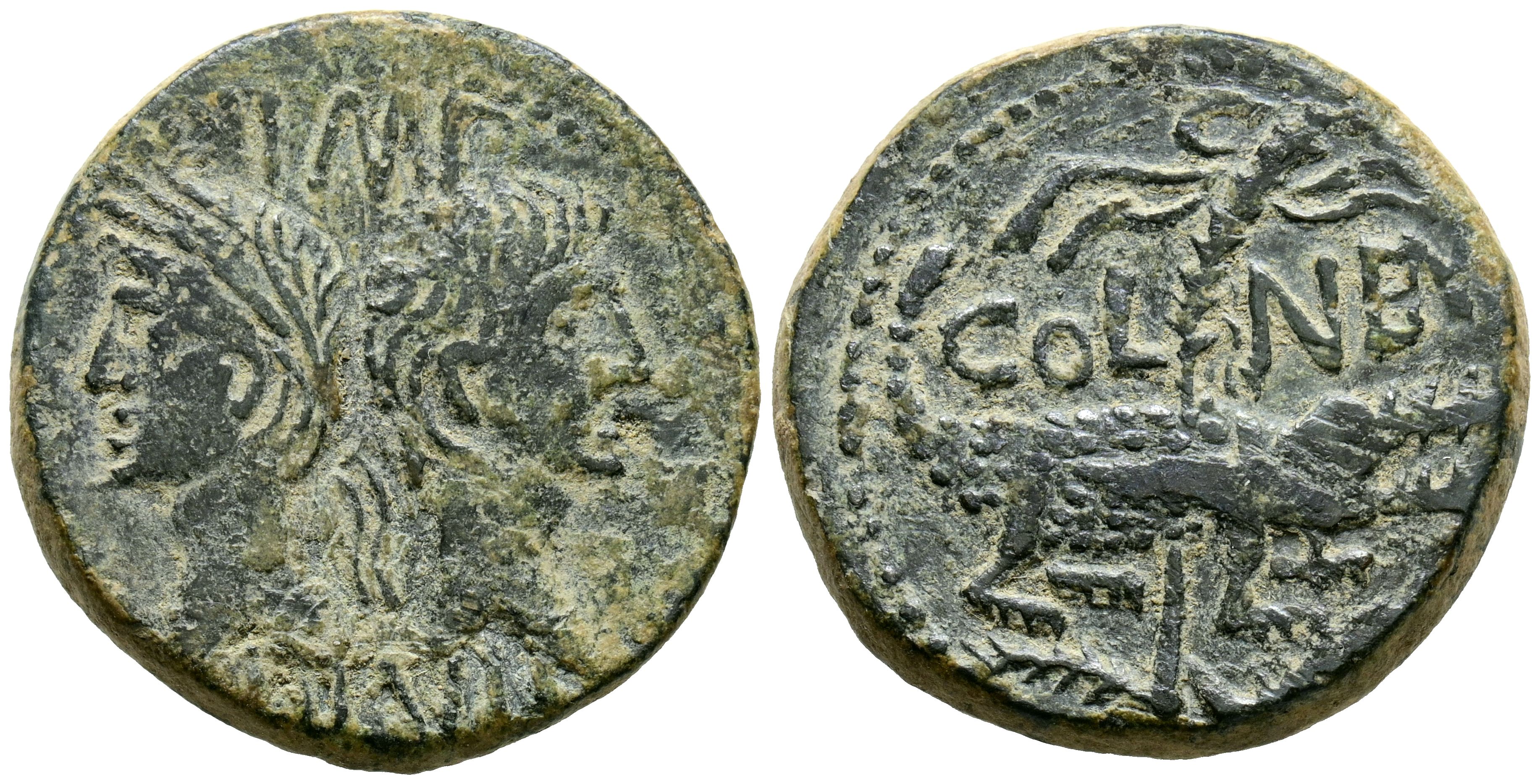 AUGUSTO. As. (Ae. 13,18g/26mm). 10-14 d.C. Colonia Nemasus. (RIC 158). Anv: Busto laureado de Augusto a izquierda, detrás busto laureado de Agripa a derecha, encima: IMP, debajo: DIVI F. Rev: Cocodrilo a derecha atado a palma, en campo corona de laurel, encima COL-NEM. MBC. Escaso ejemplar.