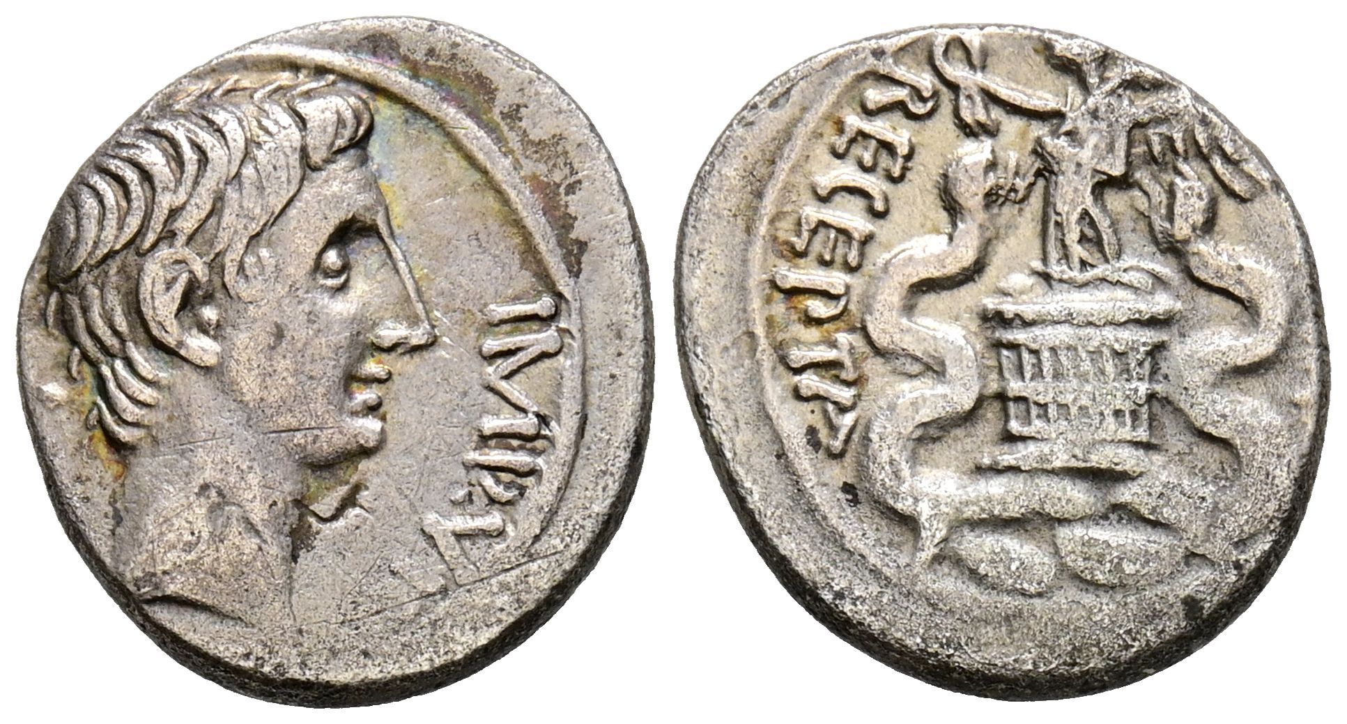 AUGUSTO. Quinario. (Ar. 1,70g/14mm). 29-28 a.C. Ceca italiana incierta. (RIC 276). Anv: Cabeza de Augusto a derecha, alrededor leyenda: CAESAR IMP VII. Rev: Victoria drapeada con corona y palma estante a izquierda sobre cista mística entre dos serpientes, alrededor leyenda: RECEPTA ASIA. MBC.