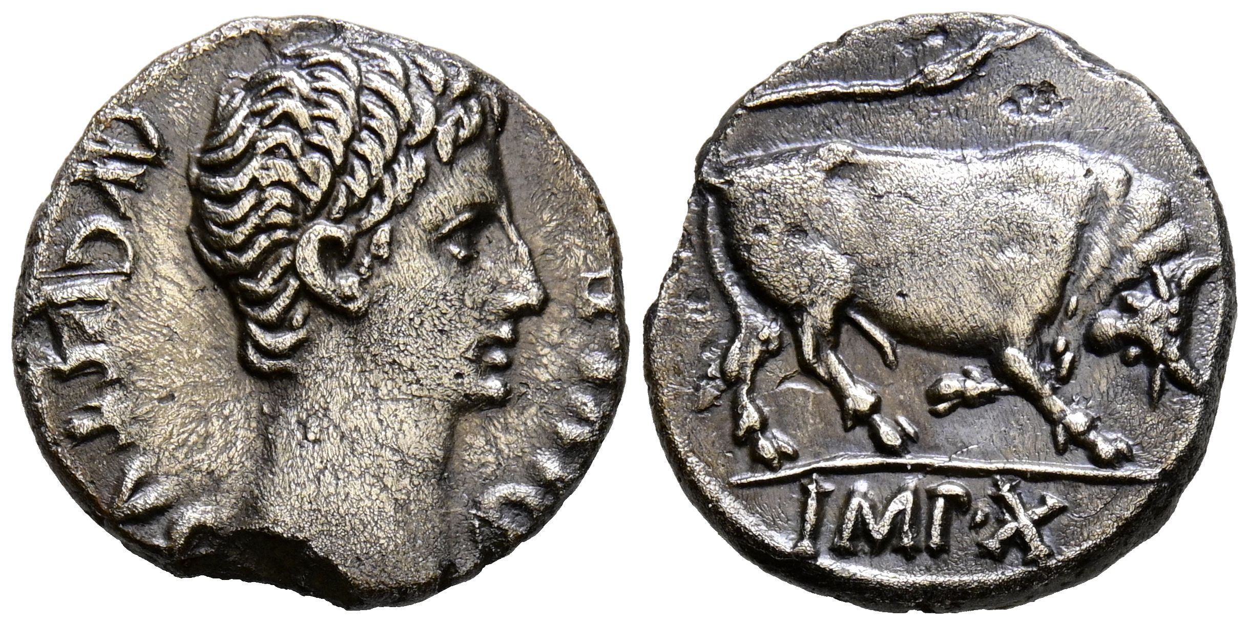 AUGUSTO. Denario. (Ar. 3,44g/17mm). 15-13 a.C. Lugdunum. (RIC 167a). Anv: Cabeza de Augusto a derecha, alrededor leyenda: AVGVSTVS DIVI F. Rev: Toro embistiendo a derecha, en exergo: IMP X. MBC+. Pequeña falta en cospel. Escaso y bonito ejemplar.