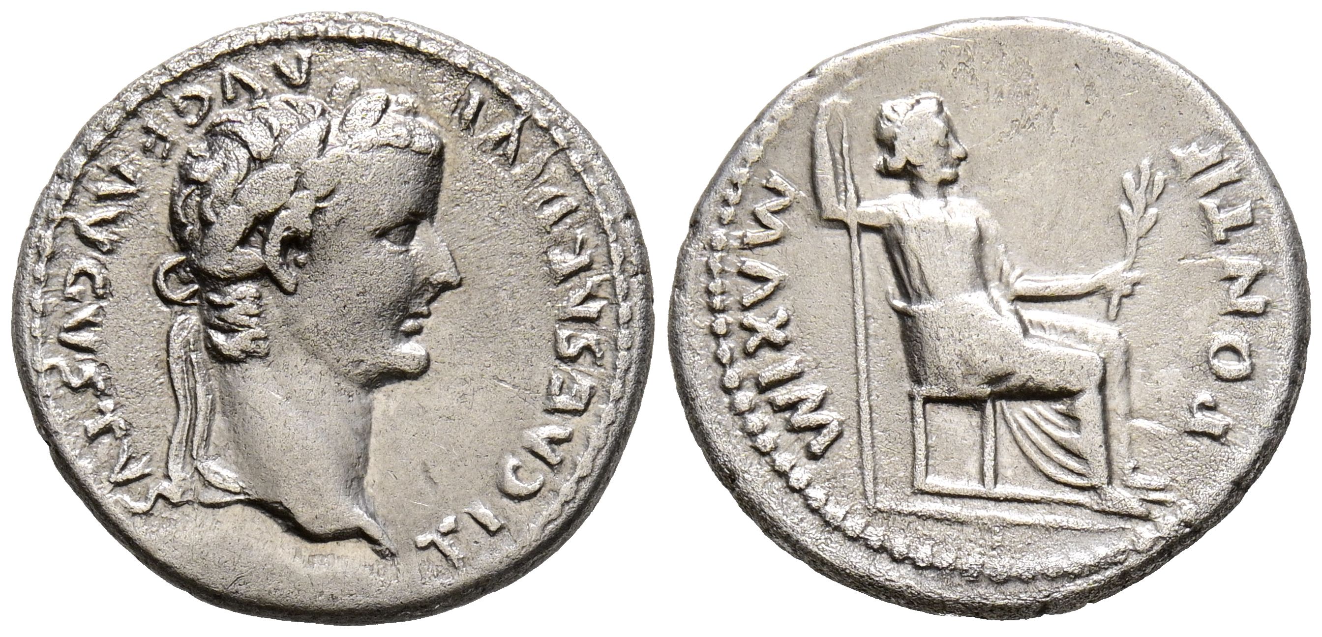 TIBERIO. Denario. (Ar. 3,65g/19mm). 14-37 d.C. Lugdunum. (RIC 30). Anv: Cabeza laureada de Tiberio a derecha portando cetro, alrededor leyenda: TI CAESAR DIVI AVGVSTVS. Rev: Livia sentada a derecha, alrededor leyenda: MAXIM PONTIF. MBC.