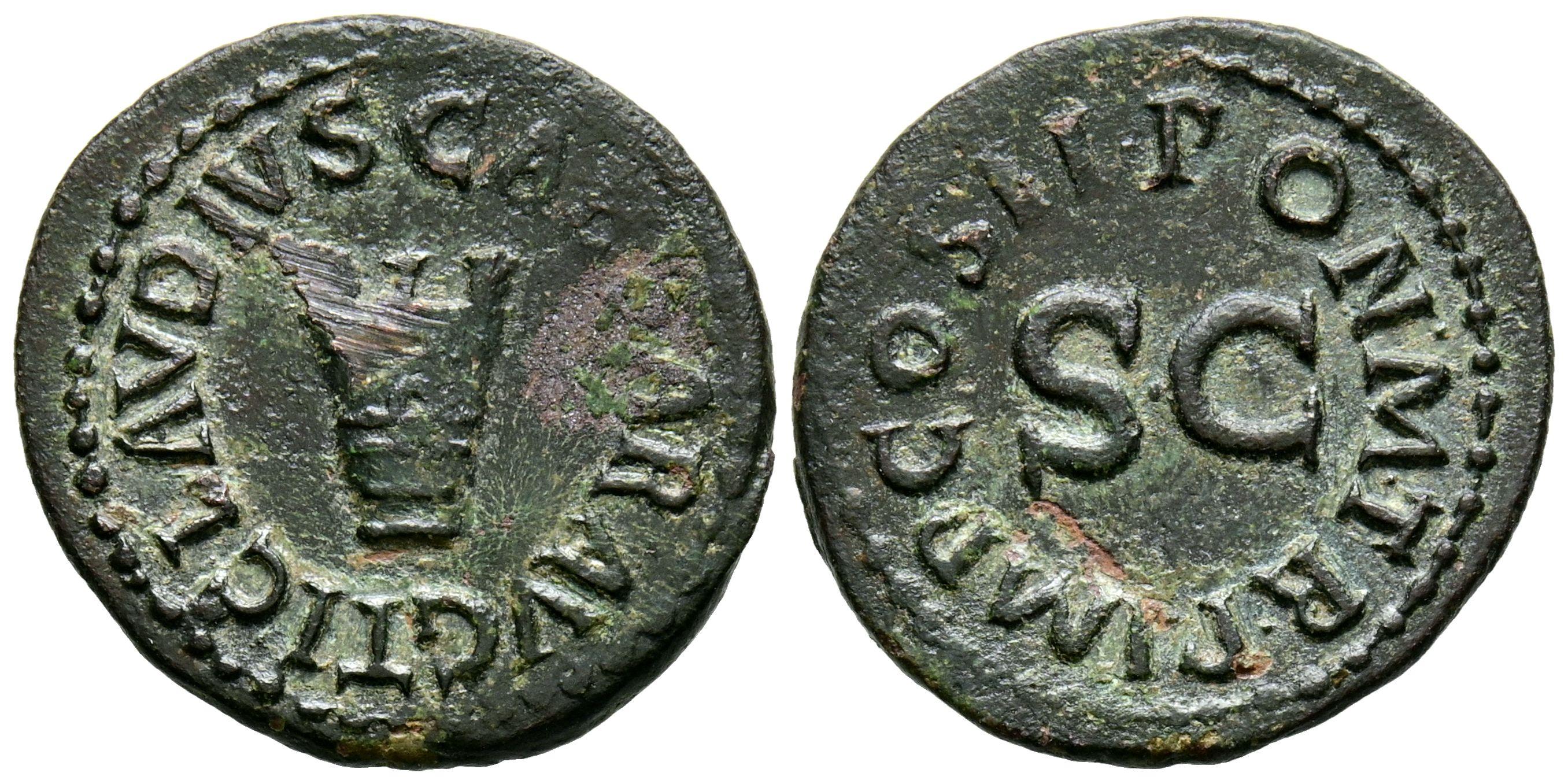 CLAUDIO I. Cuadrante. (Ae. 2,49g/19mm). 41 d.C. Roma. (RIC 84). Anv: Modio, alrededor leyenda: TI CLAVDIVS CAESAR AVG. Rev: SC, alrededor leyenda: PON M TR P IMP COS II. MBC+.