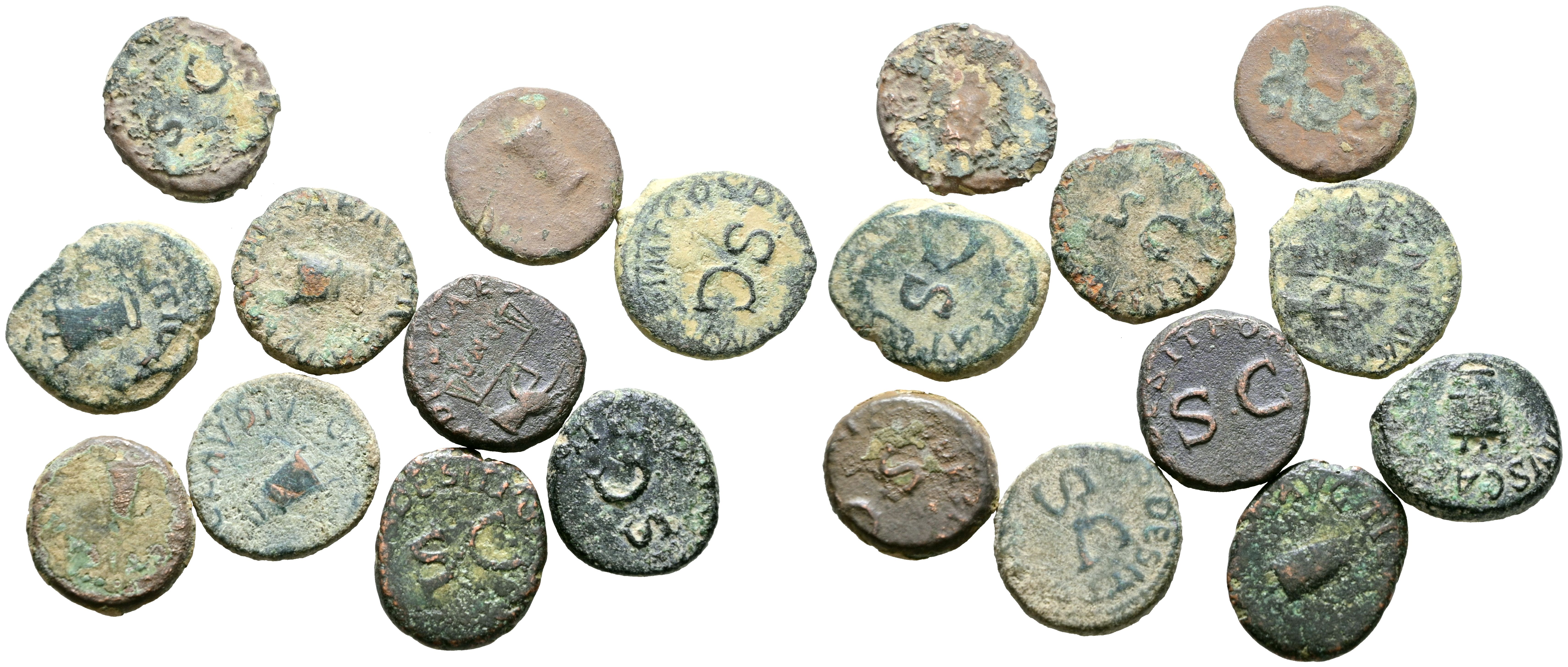 CLAUDIO I. Conjunto de 10 Cuadrantes, de los cuales 8 tienen reverso del modio y los otros dos tienen el reverso de la escala. A EXAMINAR.