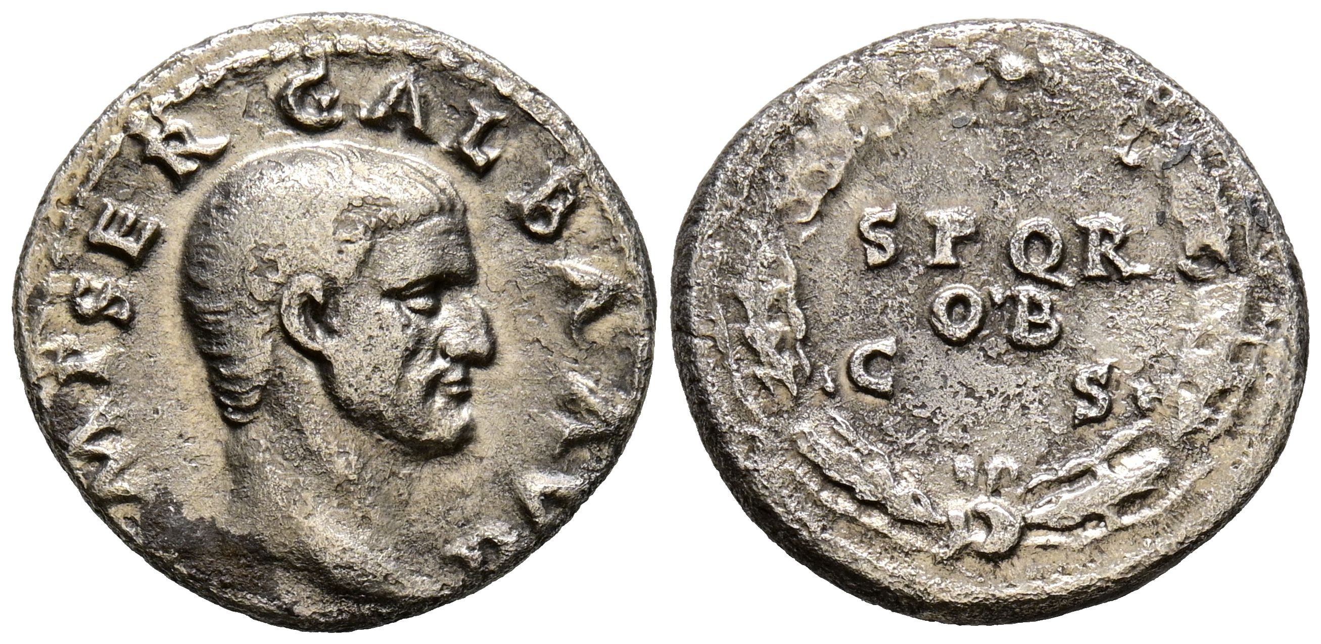 GALBA. Denario. (Ar. 3,17g/18mm). 68-69 d.C. Roma. (RIC 167). Anv: Cabeza de Galba a derecha, alrededor leyenda: IMP SER GALBA AVG. Rev: Láurea, dentro leyenda: SPQR/OB/SC. MBC. Escaso ejemplar.