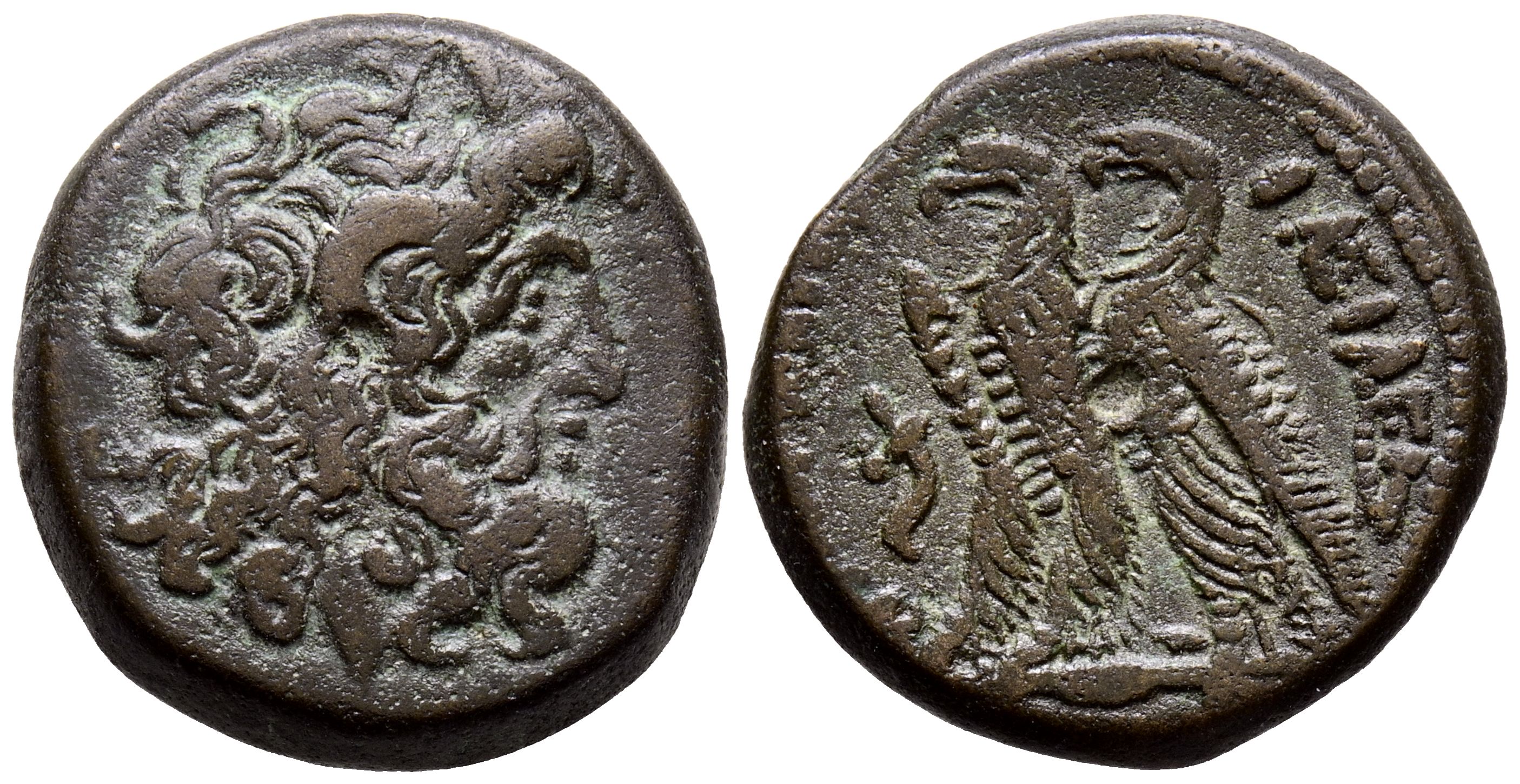 REINO PTOLEMAICO, tiempos de Cleopatra III y Ptolomeo IX hasta Ptolomeo XII. Ae19. (Ae. 7,36g/19mm). 116-51 a.C. Alejandría. (Svoronos 1426; SNG Copenhagen 311/4). Anv: Cabeza de Zeus-Ammon diademada a derecha. Rev: Dos águilas estantes a izquierda s obre rayo y cornucopia a la izquierda, alrededor leyenda griega: ΠΤΟΛΕΜΑΙΟΥ ΒΑΣΙΛΕΩΣ. MBC.