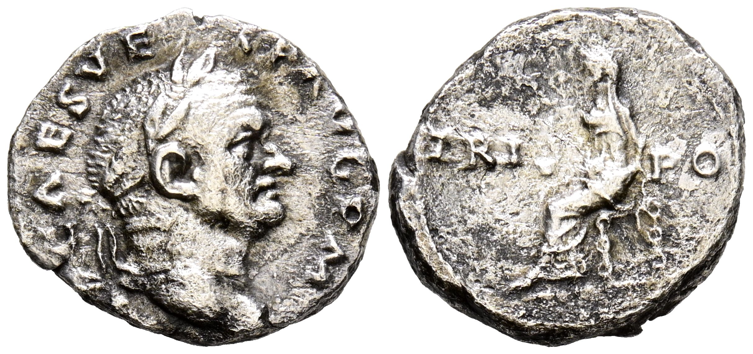 VESPASIANO. Denario. (Ar. 3,14g/17mm). 71 d.C. Roma. (RIC 46). Anv: Cabeza laureada de Vespasiano a derecha, alrededor leyenda: IMP CAES VESP AVG P M. Rev: Vesta sentada a izquierda portando simpulum, entre: TRI-POT. MBC-. Limpiado.
