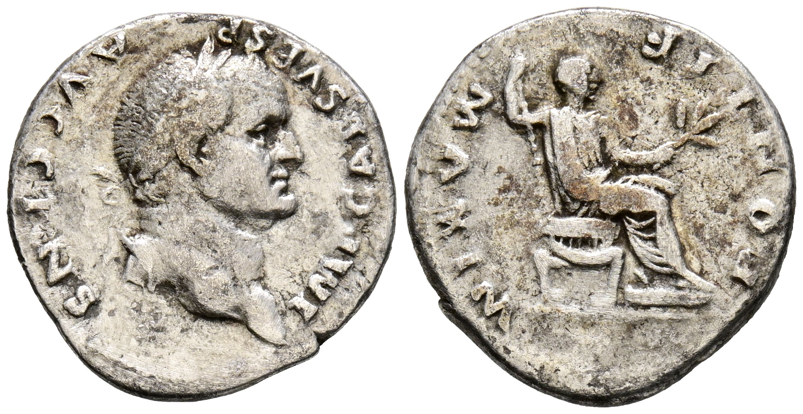 VESPASIANO. Denario. (Ar. 3,23g/19mm). 73 d.C. Roma. (RIC 65). Anv: Cabeza laureada de Vespasiano a derecha, alrededor leyenda: IMP CAES VESP AVG CENS. Rev: Vespasiano sentado a derecha portando cetro y rama, alrededor leyenda: PONTIF MAXIM. MBC-.