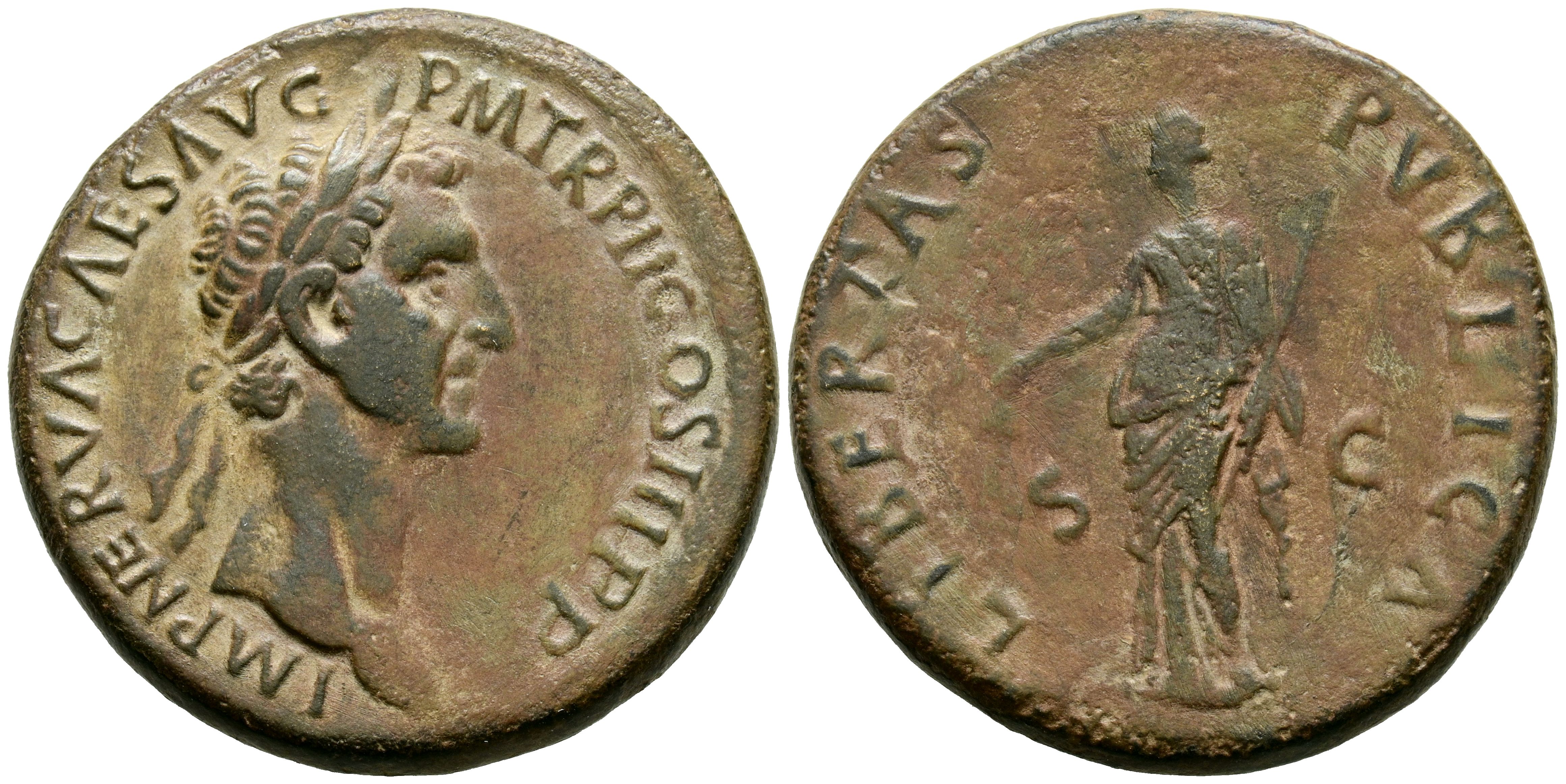 NERVA. Sestercio. (Ae. 21,52g/32mm). 97. Roma. (RIC 86). Anv: Cabeza laureada de Nerva a derecha, alrededor leyenda: IMP NERVA CAES AVG P M TR P COS III P P. Rev: Libertad en pie a izquierda, sosteniendo gorro y cetro. LIBERTAS PVBLICA S C. MBC. Repasado y repatinado.