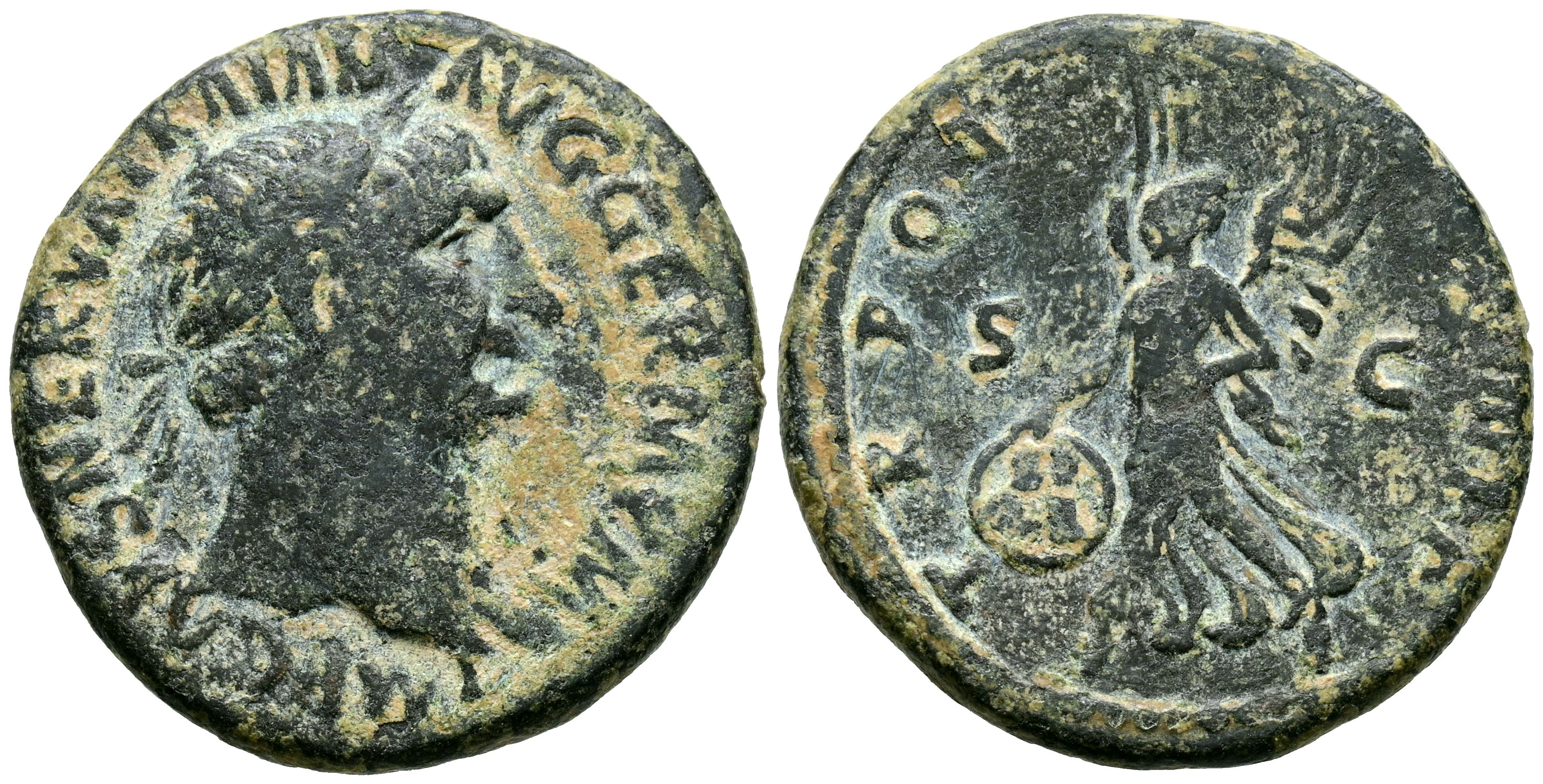 TRAJANO. As. (Ae. 10,26g/27mm). 100 d.C. Roma. (RIC 417). Anv: Cabeza laureada de Trajano a derecha, alrededor leyenda: MIP AES NERVA TRAIAN AVG GERM P M. Rev: Victoria avanzando a izquierda portando escudo con inscripción: SP/QR, entre: S-C, alrededor leyenda: TR POT COS III P P. MBC-.