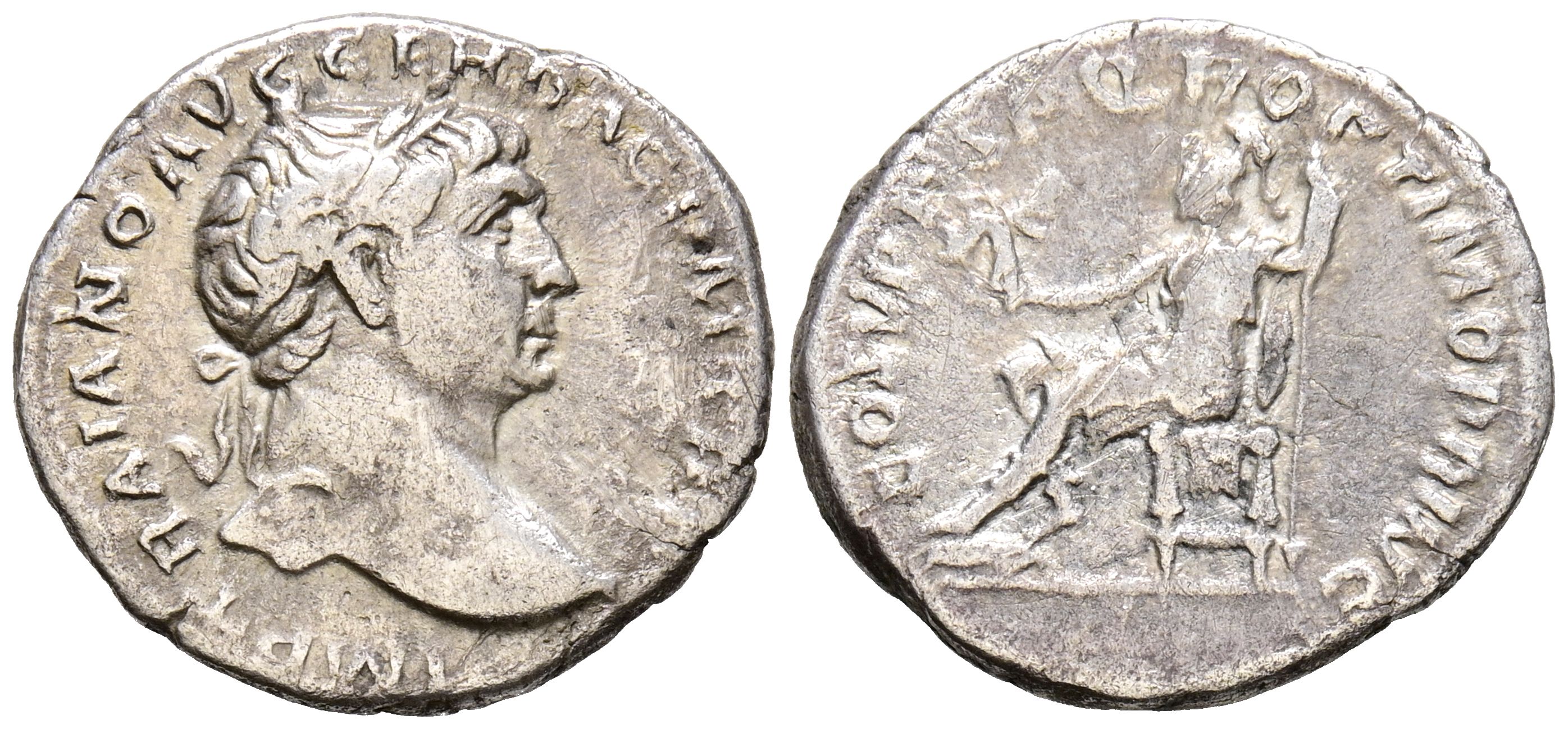 TRAJANO. Denario. (Ar. 3,12g/19mm). 108-109 d.C. Roma. (RIC 116). Anv: Cabeza laureada de Trajano a derecha, alrededor leyenda: IMP TRAIANO AVG GER DAC P M TR P. Rev: Roma sentada a izquierda portando lanza y portando Victoria con corona de laurel, alrededor leyenda: COS V P P SPQR OPTIMO PRINC. MBC.