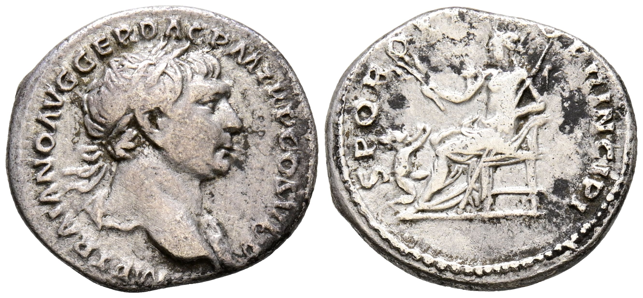 TRAJANO. Denario. (Ar. 3,27g/18mm). 107 d.C. Roma. (RIC 188). Anv: Busto laureado a derecha, alrededor leyenda: IMP TRAIANO AVG GER DAC P M TR P COS V P P. Rev: Pax sentada a izquierda con con rama de olivo y cetro, a sus pies cautivo, alrededor leyenda: SPQR OPTIMO PRINCIPI. MBC.