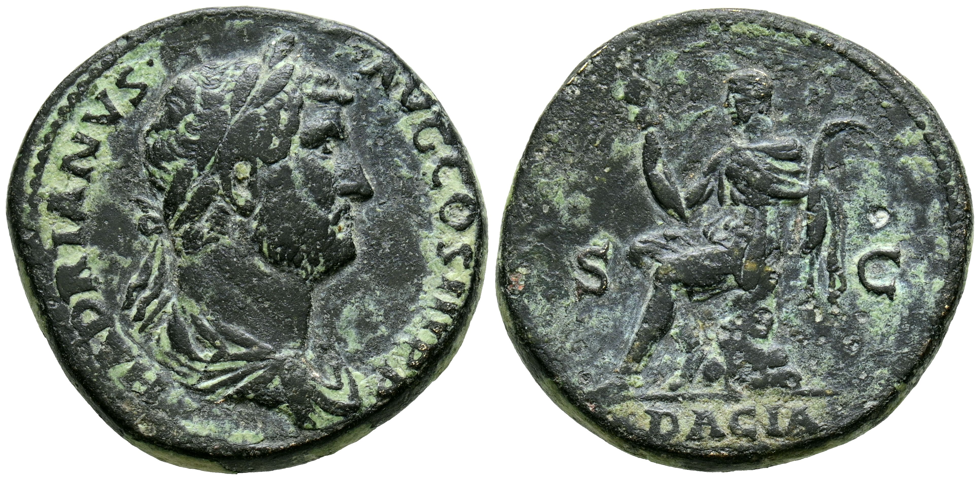 ADRIANO. As. (Ae. 14,12g/27mm). 130-133 d.C. Roma. (RIC 1658). Anv: Busto laureado y drapeado de Adriano a izquierda, alrededor leyenda: HADRIANVS AVG COS III P P. Rev: Dacia sentada a izquierda portando estandarte y hoz, entre: S-C, en exergo: DACIA. MBC-.