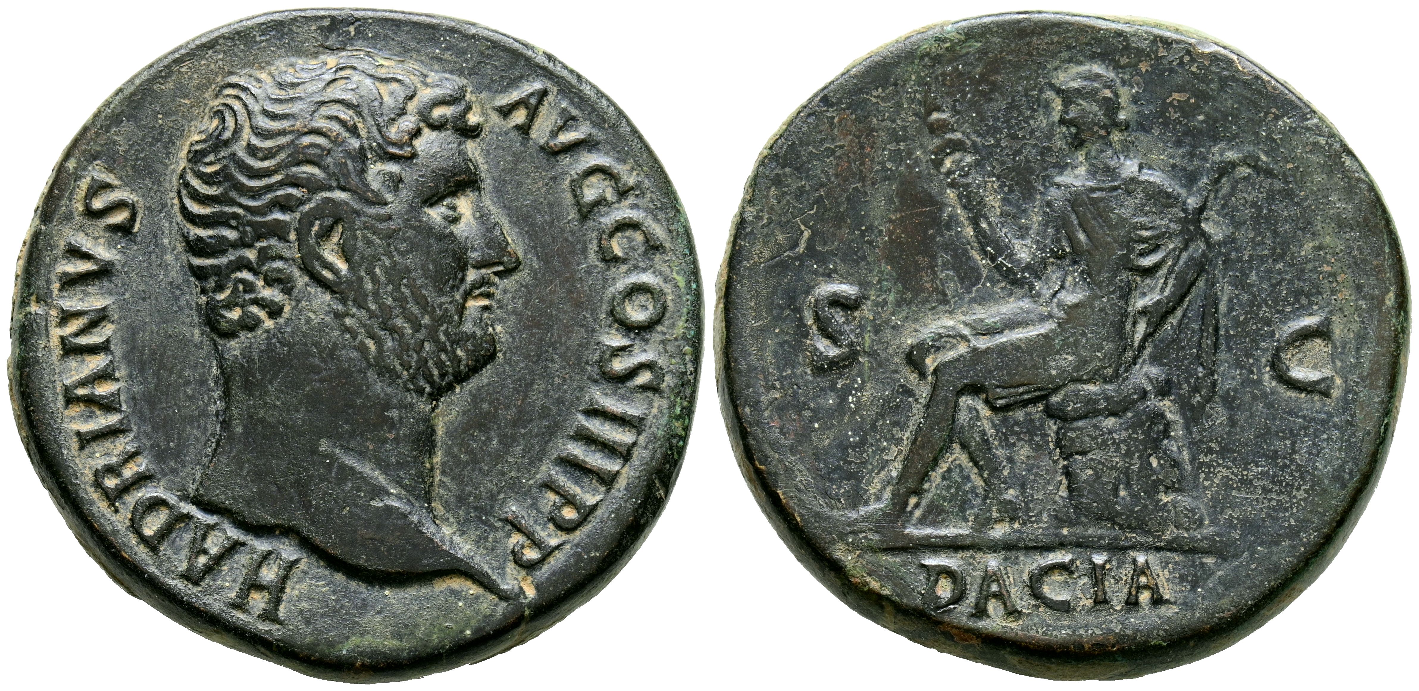 ADRIANO. Sestercio. (Ae. 27,29g/33mm). 130-133 d.C. Roma. (RIC 1651). Anv: Cabeza de Adriano a derecha, alrededor leyenda: HADRIANVS AVG COS III P P. Rev: Dacia sentada a izquierda sobre pila de rocas portando estandarte y espada curva, entre: S-C, debajo: DACIA. MBC. Retocado. Escaso ejemplar.
