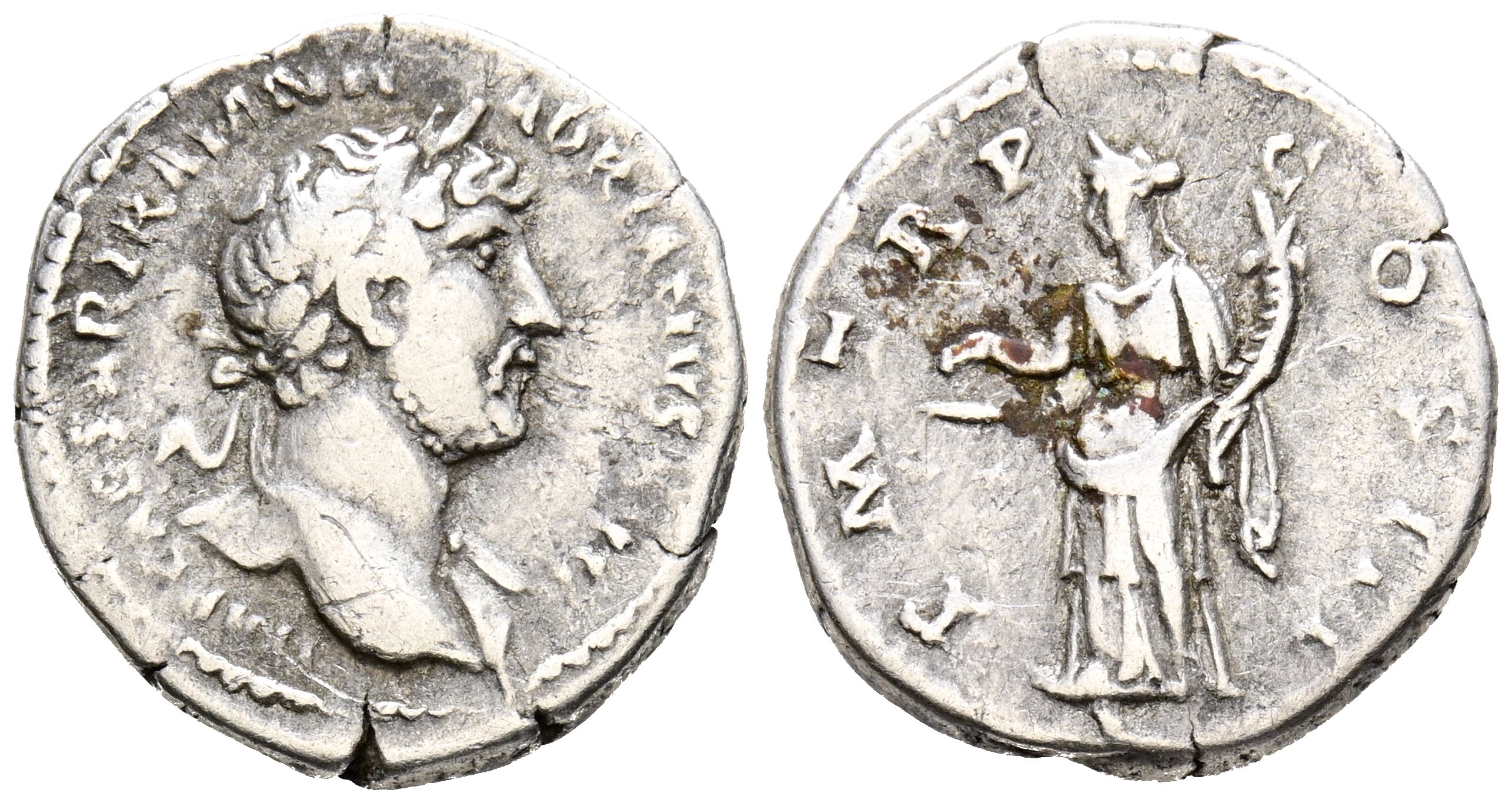 ADRIANO. Denario. (Ar. 3,31g/19mm). 117-138 d.C. Roma. (RIC 385). Anv: Busto laureado de Adriano a derecha con ligero drapeado en hombro izquierdo, alrededor leyenda: IMP CAESAR TRAIAN HADRIANVS AVG. Rev: Aequitas con escalas y cornucopia, alrededor leyenda: P M TR P COS III. MBC.