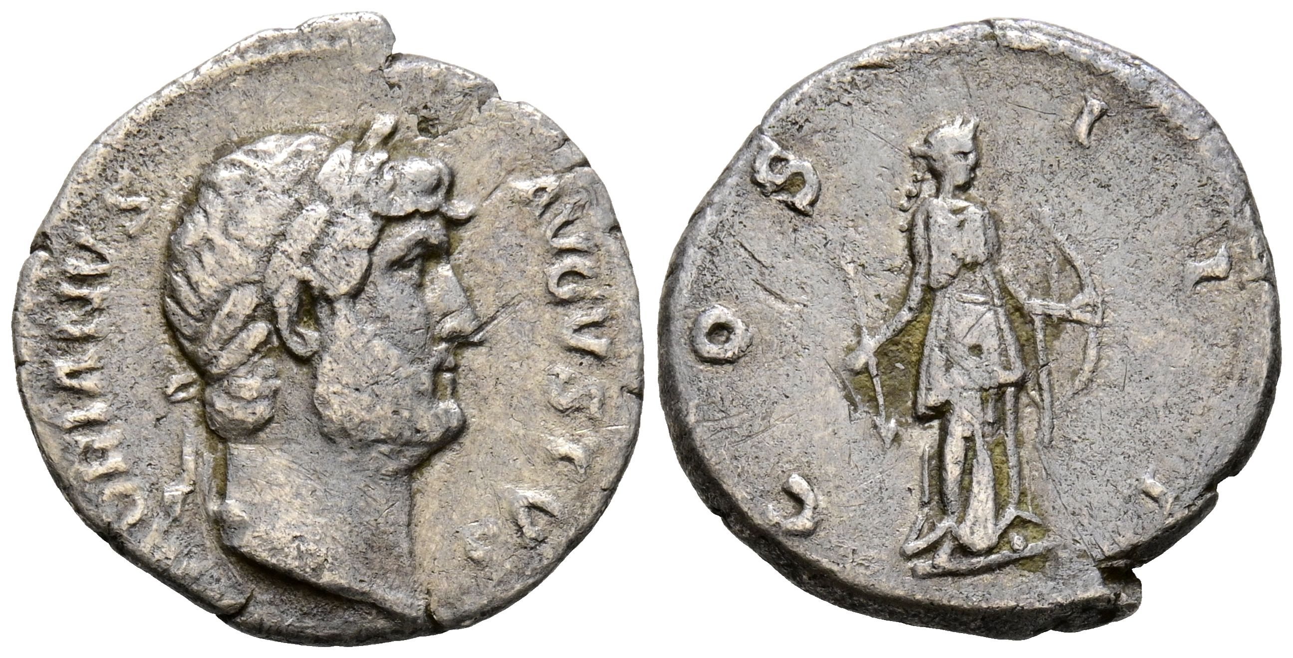 ADRIANO. Denario. (Ar. 3,05g/18mm). 125-128 d.C. Roma. (RIC 729). Anv: Cabeza laureada de Adriano a derecha, alrededor leyenda: HADRIANVS AVGVSTVS. Rev: Diana estante a derecha portando flecha y arco, alrededor leyenda: COS III. MBC.