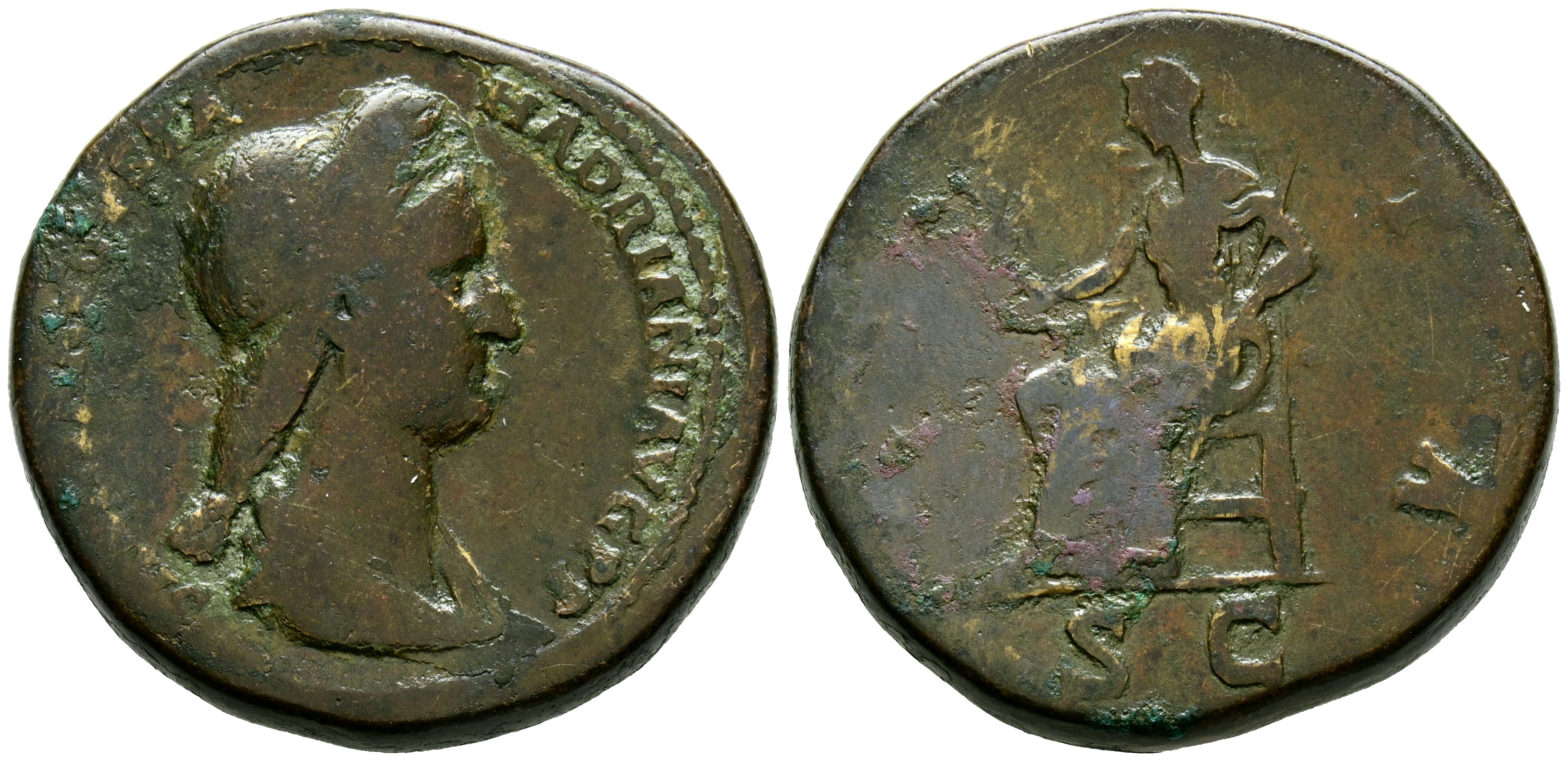SABINA. Sestercio. (Ae. 25,60g/29mm). 128-134 d.C. Roma. (RIC 1036). Anv: Busto diademado y drapeado de Sabina a derecha, alrededor leyenda: SABINA AVGVSTA HADRIANI AVG P P. Rev: Vesta sentada a izquierda portando paladio y cetro, en exergo: SC, alrededor leyenda: VESTA. MBC-. Limpiado.