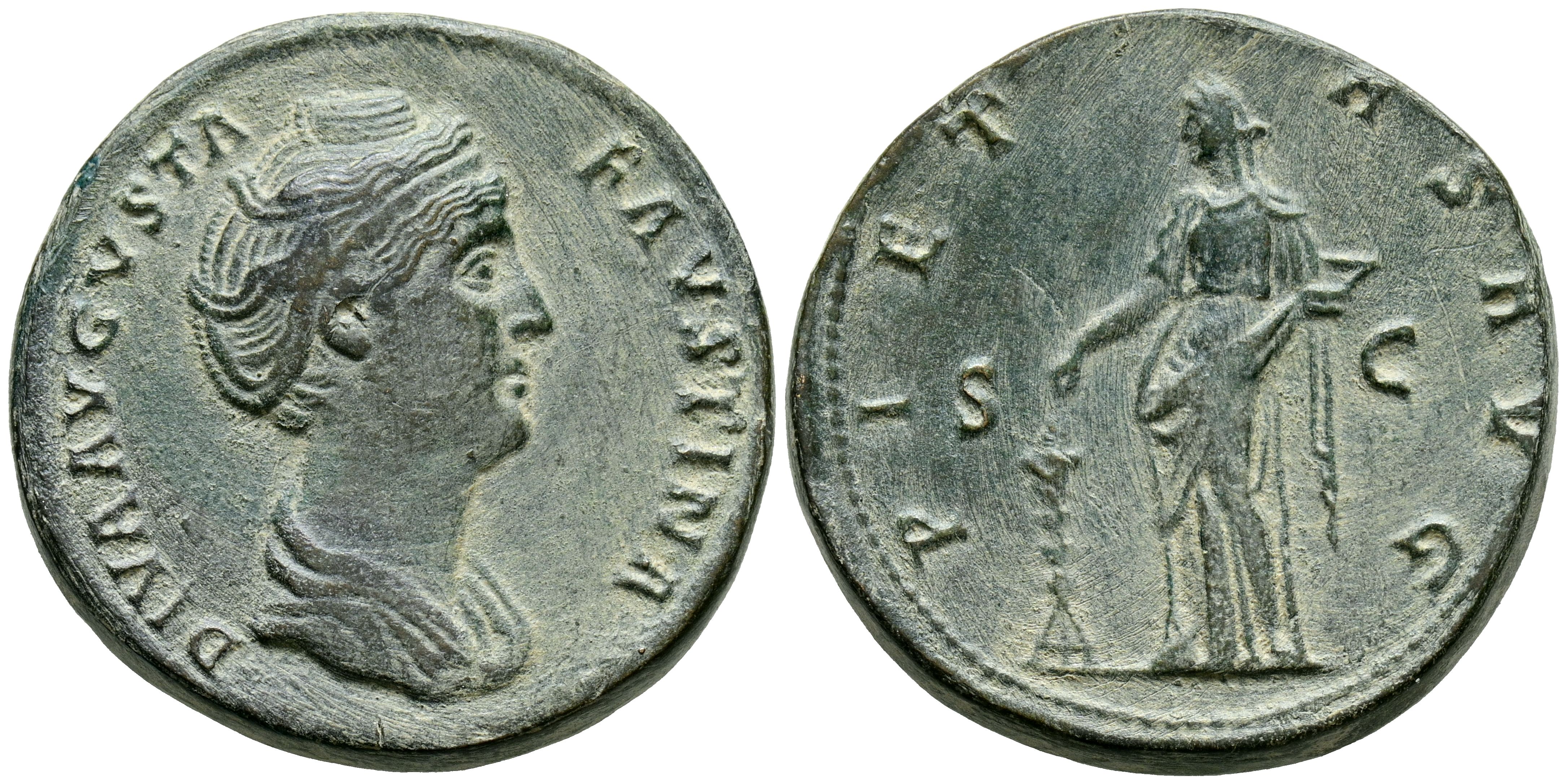 FAUSTINA I. Sestercio. (Ae. 21,15g/31mm). 140-141 d.C. Roma. (RIC 1146a). Anv: Busto diademado y drapeado de Faustina I a derecha, alrededor leyenda: DIVA AVGVSTA FAVSTINA. Rev: Pietas estante a izquierda soltando incienso sobre altar y portando caja, entre: S-C, alrededor leyenda: PIETAS AVG. MBC. Limpiado y retocado.