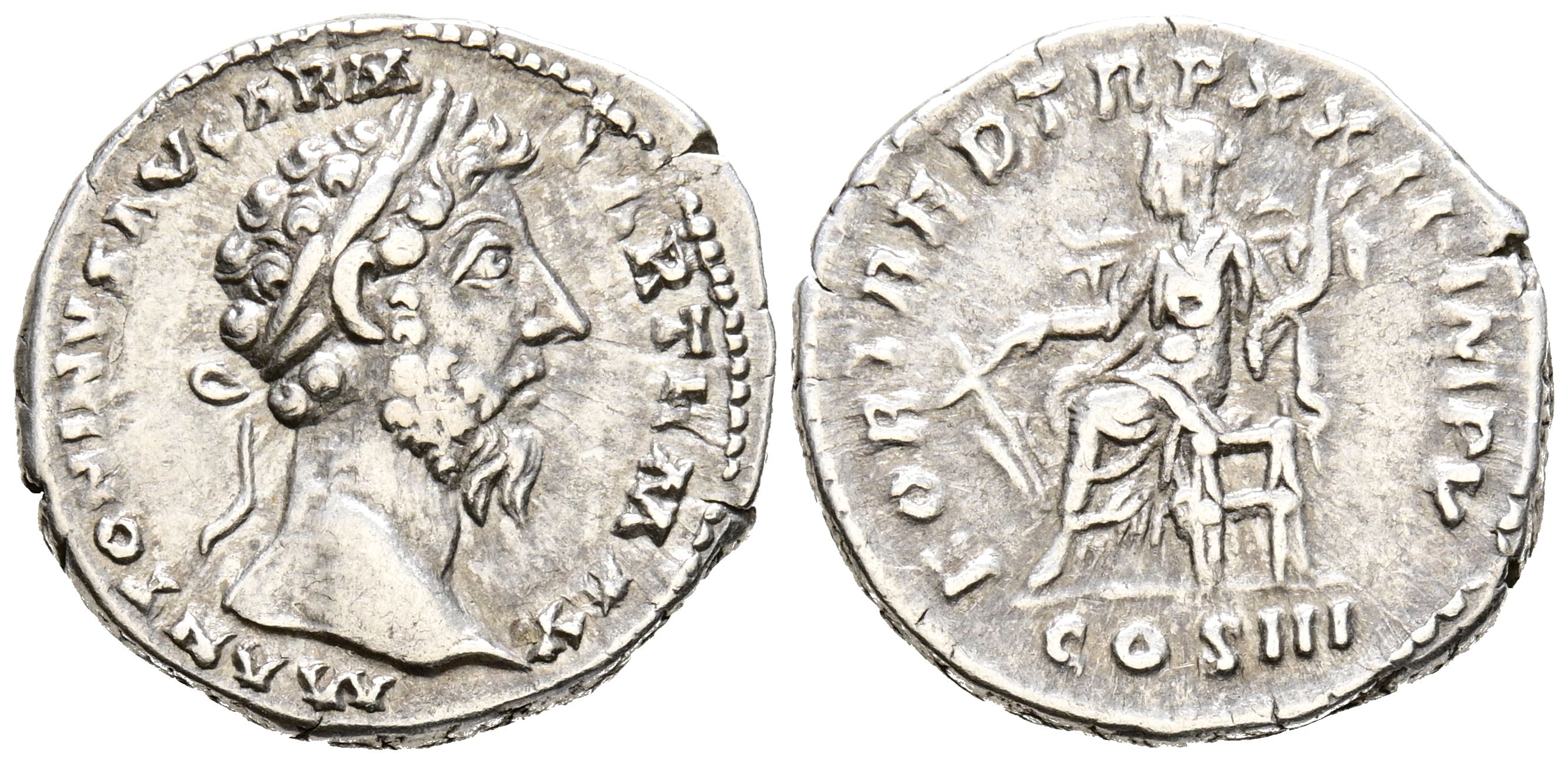 MARCO AURELIO. Denario. (Ar. 3,03g/19mm). 168 d.C. Roma. (RIC 185). Anv: Busto laureado de Marco Aurelio a derecha, alrededor leyenda: M ANTONINVS AVG ARM PARTH MAX. Rev: Fortuna sentada a izquierda portando cornucopia y timón, en exergo: COS III, alrededor leyenda: FORTRED TR P XXII IMP V. MBC.