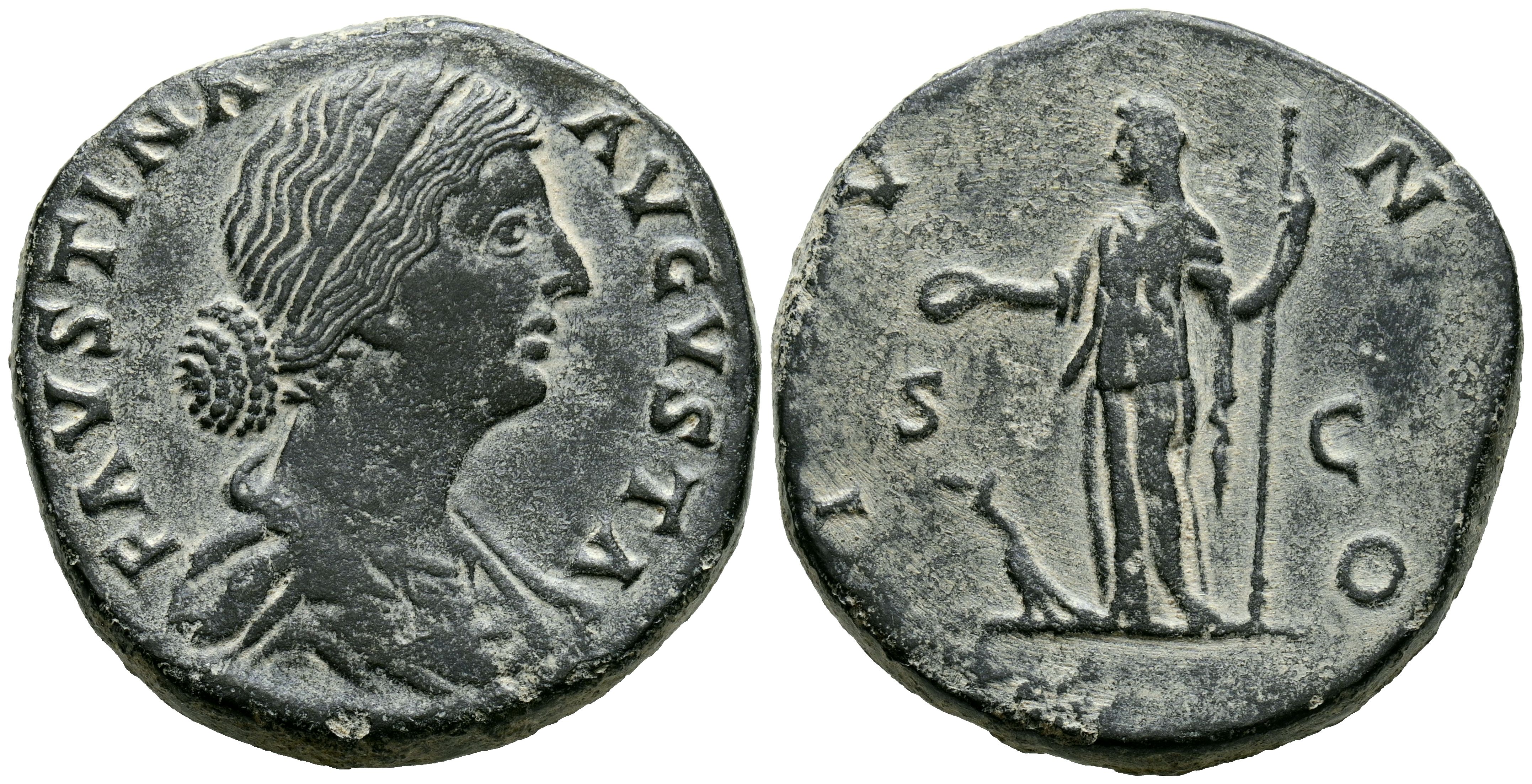 FAUSTINA II. Sestercio. (Ae. 25,59g/30mm). 161-176 d.C. Roma. (RIC 1645). Anv: Busto drapeado de Faustina II a derecha, alrededor leyenda: FAVSTINA AVGVSTA. Rev: Juno estante a izquierda portando patera y cetro, delante pavo real, entre: S-C, alrededor leyenda: IVNO. MBC. Repasada y repatinada.