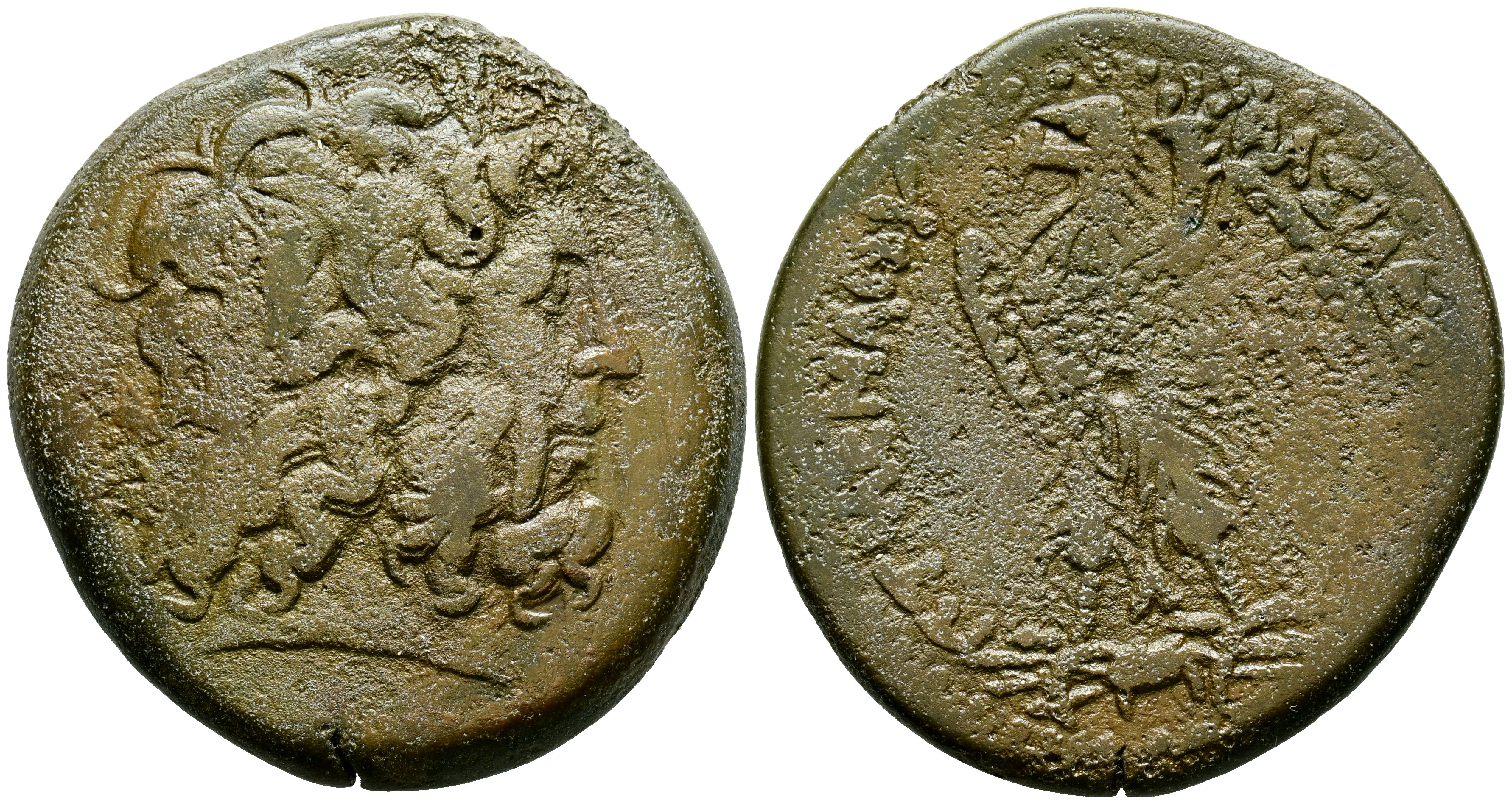 REINO PTOLEMAICO, Ptolomeo III Euergetes. Ae36 (Ae. 28,53g/36mm). 222-205/4 a.C. Alejandría. (Svoronos 1167). Anv: Cabeza de Zeus-Ammon diademada a derecha. Rev: Aguila estante a izquierda sobre rayo, cornucopia sobre el hombro, entre las patas Λ, al rededor leyenda griega: ΒΑΣΙΛΕΩΣ ΠΤΟΛΕΜΑΙΟΥ. MBC.