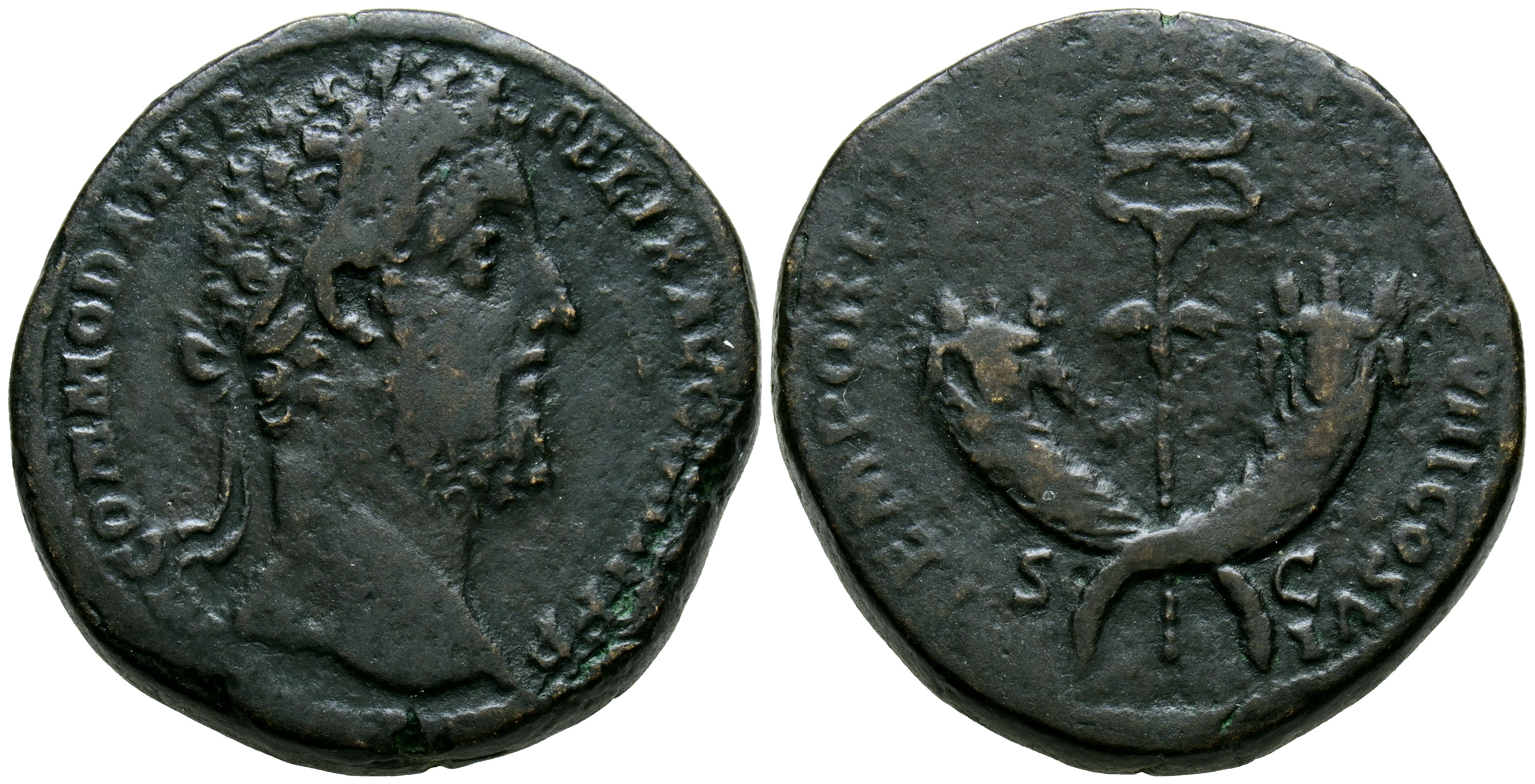 COMODO. Sestercio. (Ae. 24,52g/30mm). 190 d.C. Roma. (RIC 566). Anv: Cabeza laureada de Cómodo a derecha, alrededor leyenda: M COMMODVS ANT P FELIX AVG BRIT. Rev: Caduceo entre dos cornucopias, entre: S-C, alrededor leyenda: TEMPOR FELIC P M TR P XV IMP VIII COS VI. MBC. Repasado y repatinado.