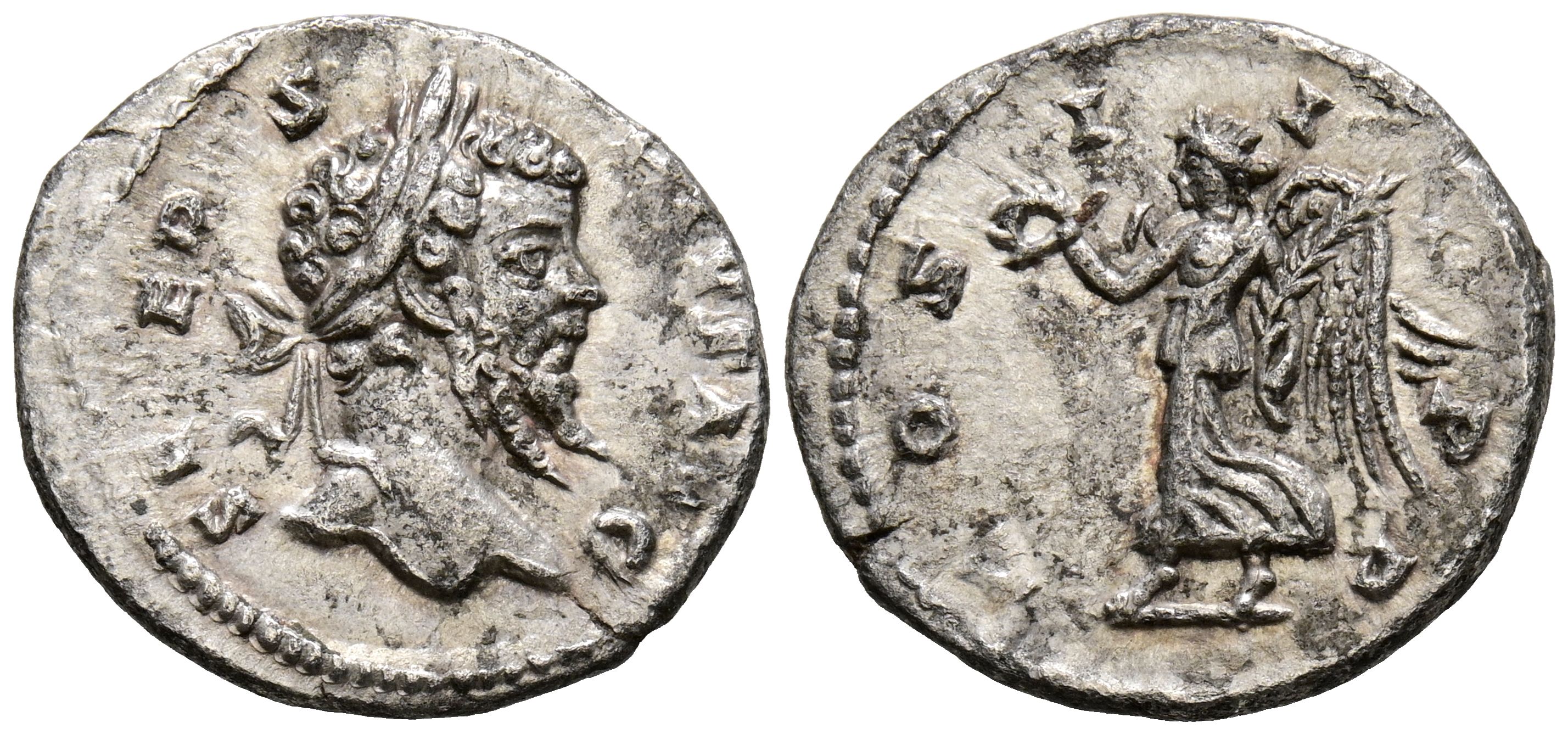 SEPTIMIO SEVERO. Denario. (Ar. 3,09g/20mm). 202 d.C. Laodicea. (RIC 526). Anv: Cabeza laureada de Septimio Severo a derecha, alrededor leyenda: SEVERVS PIVS AVG. Rev: Victoria avanzando a izquierda portando corona de laurel, alrededor leyenda: COS III P P. MBC+.