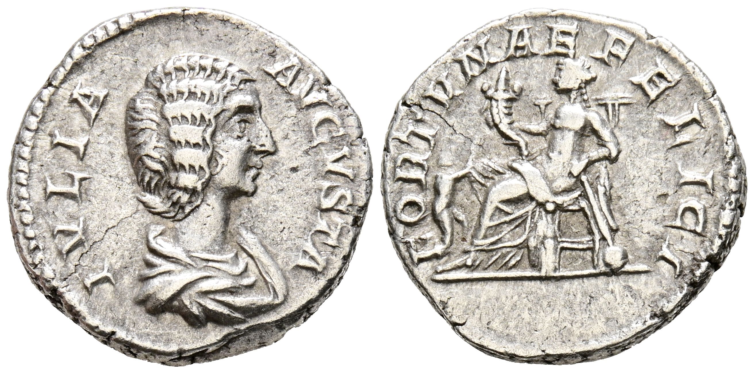 JULIA DOMNA. Denario. (Ar. 3,65g/18mm). 196-211 d.C. Roma. (RIC 554). Anv: Busto drapeado de Julia Domna a derecha, alrededor leyenda: IVLIA AVGVSTA. Rev: Fortuna sentada a izquierda portando cornucopia y apoyándose en timón, niño a sus pies, alrededor leyenda: FORTVNAE FELICI. MBC.