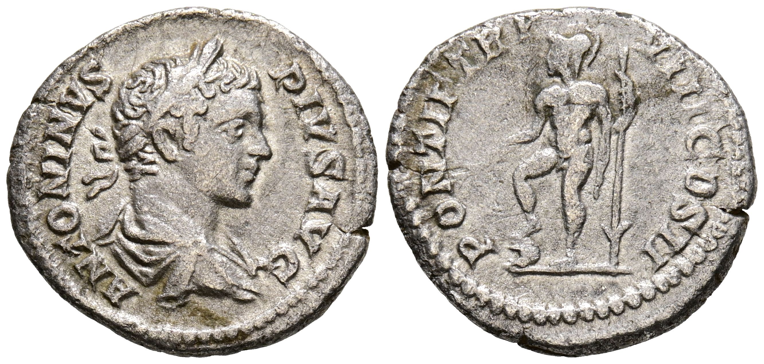 CARACALLA. Denario. (Ar. 2,57g/18mm). 205 d.C. Roma. (RIC 80b). Anv: Busto laureado y drapeado de Caracalla a derecha, alrededor leyenda: ANTONINVS PIVS AVG. Rev: Marte desnudo a izquierda con rama y lanza, pisando un casco, alrededor leyenda: PONTIF TR P VIII COS II. MBC.