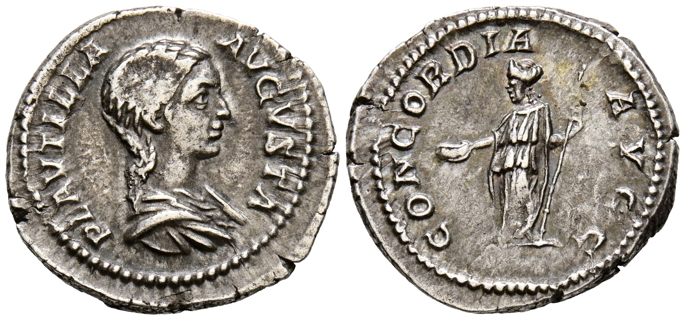 PLAUTILLA. Denario. (Ar. 3,31g/20mm). 202-205 d.C. Roma. (RIC 363a). Anv: Busto drapeado de Plautilla a derecha, alrededor leyenda: PLAVTILLA AVGVSTA. Rev: Concordia estante a izquierda portando patera y cetro, alrededor leyenda: CONCORDIA AVGG. MBC+. Bonito ejemplar.